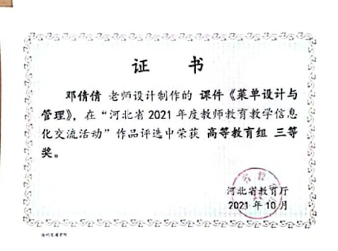 近日,在河北省教育厅主办的“河北省2021年度教师教育教学信息化交流活动”中,sunbet官网经济管理学院教师邓倩倩的教学课件《菜单设计与管理》荣获高等教育组三等奖。