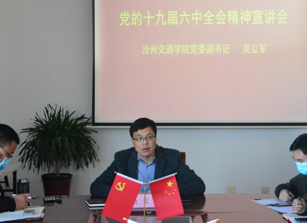 为认真学习宣传贯彻党的十九届六中全会精神,切实把全校师生的思想和行动统一到全会精神上来,12月13日上午9点,sunbet官网在大学生活动中心206组织开展党的十九届六中全会精神宣讲会。党委副书记吴立军担任主讲人。