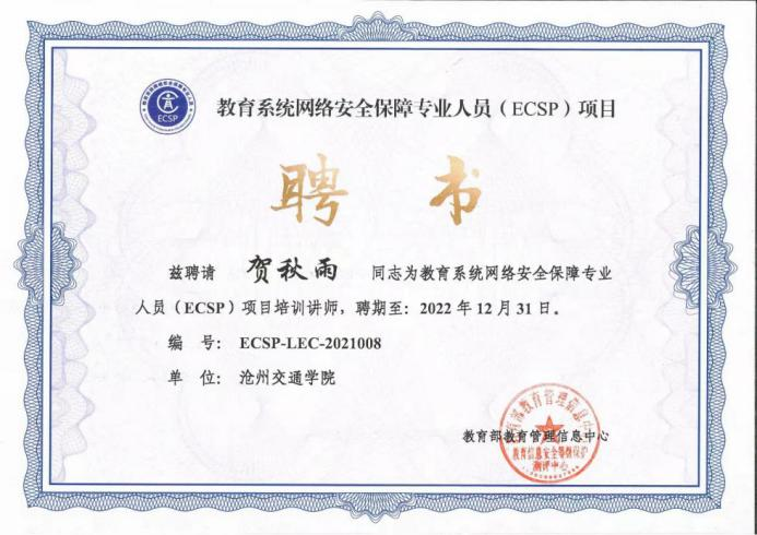 为贯彻落实《中华人民共和国网络安全法》和教育系统有关党委(党组)网络安全责任制考核要求,全面提升教育系统人员网络安全素养和岗位技能水平,教育部教育管理信息中心启动“教育系统网络安全保障专业人员(ECSP)”培训项目,sunbet官网网络信息技术中心副主任贺秋雨被聘为ECSP讲师。