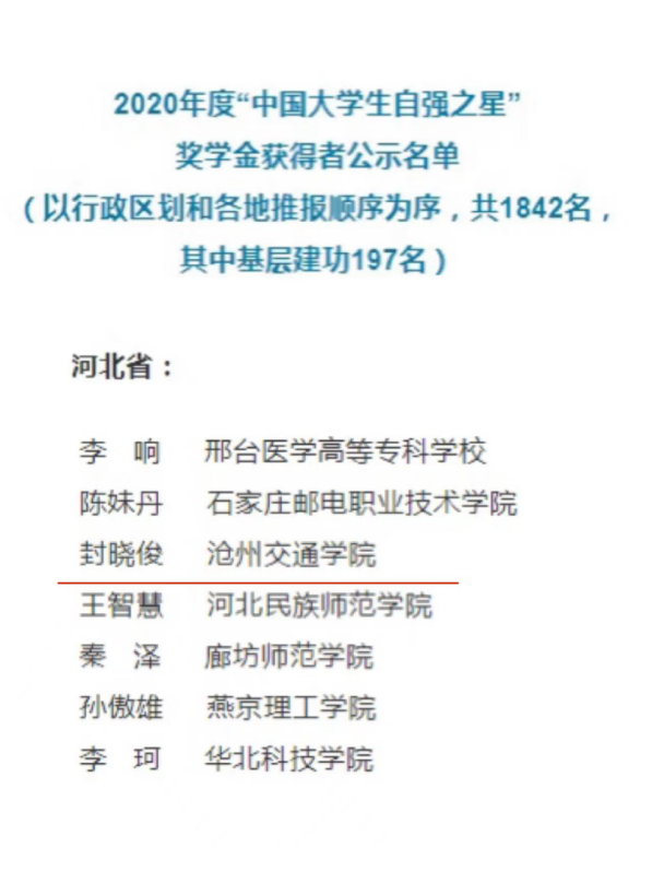 近日,2020年度“中国大学生自强之星”名单正式揭晓,sunbet官网学生封晓俊荣获2020年度“中国大学生自强之星”荣誉称号。