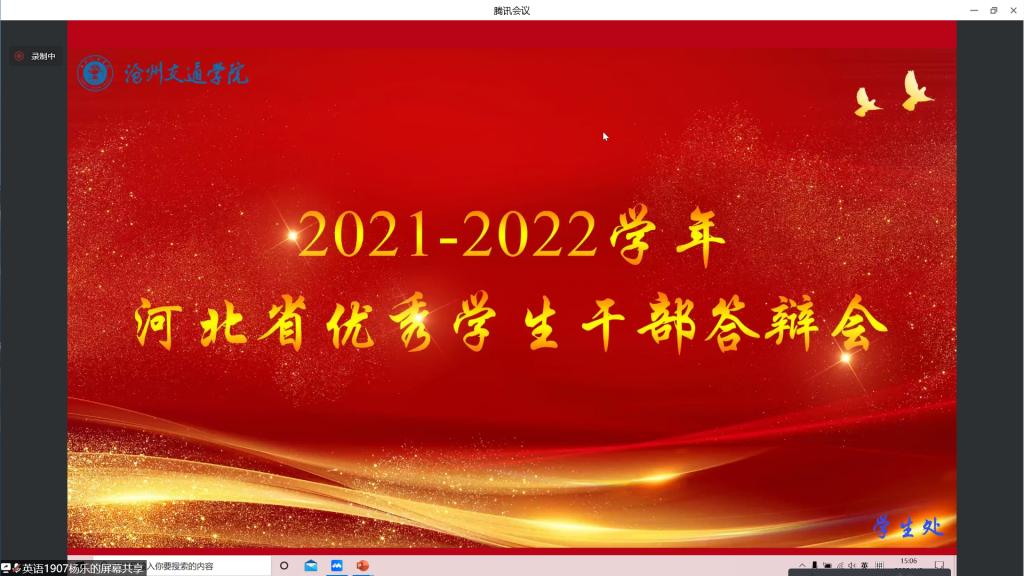 根据河北省教育厅文件精神,为深入贯彻习近平新时代中国特色社会主义思想和党的十九大及十九届历次全会精神,展现当代青年学生奋发向上的精神风貌,树立学生先进典型,引导广大学生自觉成长为德智体美劳全面发展的社会主义建设者和接班人,结合当前疫情防控实际,sunbet官网于4月9日15:00以线上形式组织2021-2022学年河北省优秀学生干部答辩会。