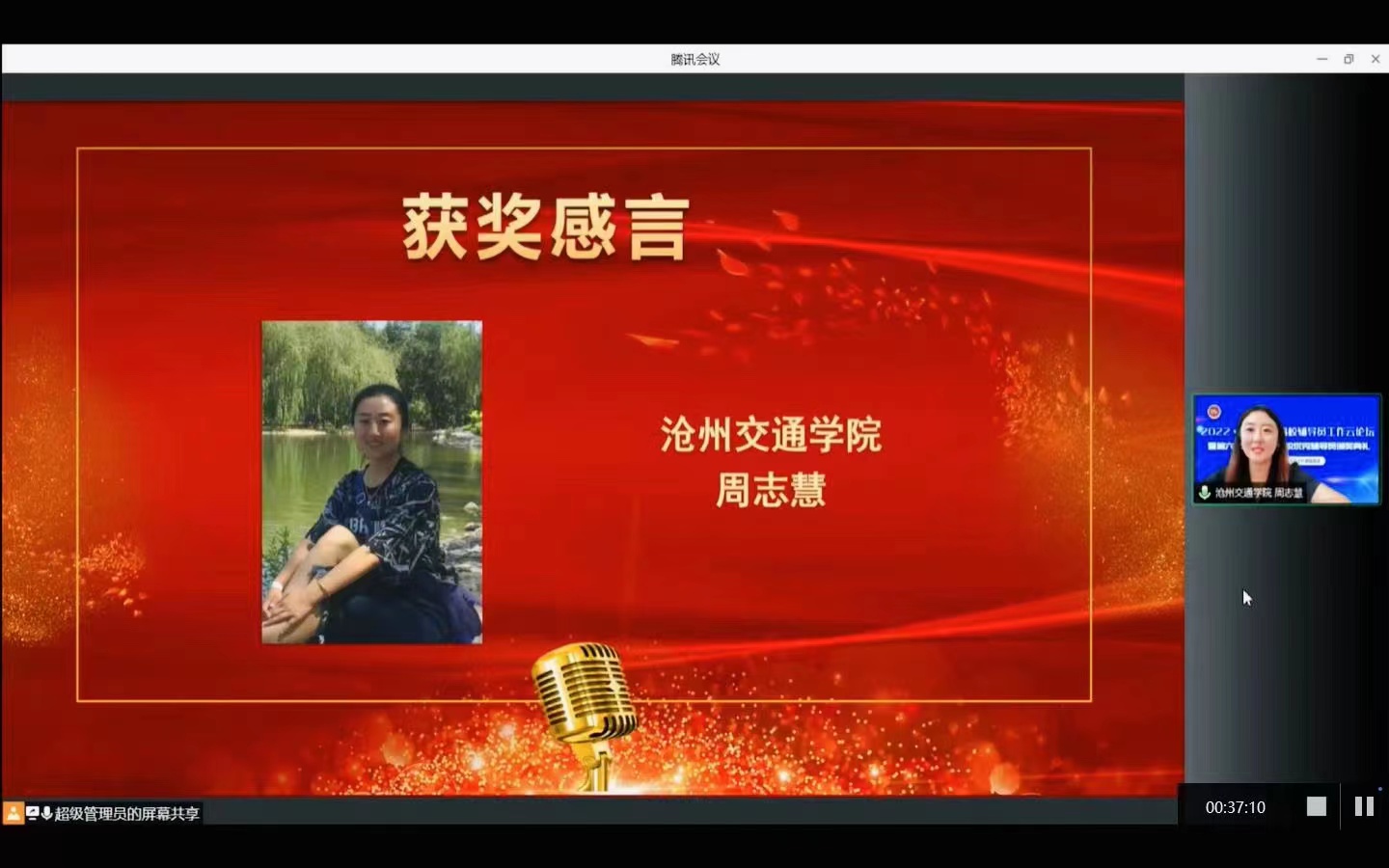6月25-26日,2022全国民办高校辅导员工作云论坛暨第六届全国民办高校优秀辅导员颁奖典礼在线上隆重举行。sunbet官网外国语学院团委书记、辅导员周志慧凭借良好的政治素养、扎实的理论功底和出色的业务能力,荣获“2021年全国民办高校优秀辅导员”荣誉称号,并在颁奖典礼上作为获奖代表发言。