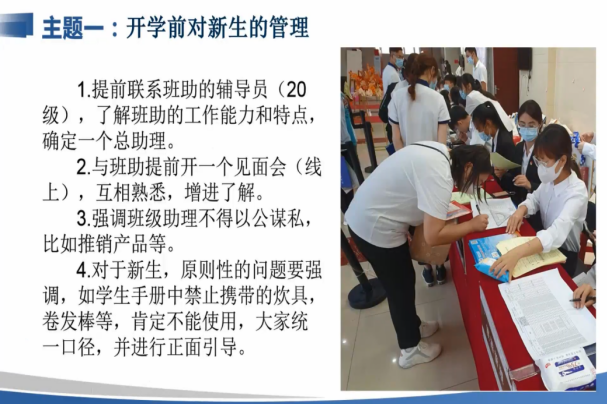 而后,2021级辅导员宋哲、王萌进行经验分享。经济管理学院宋哲就开学前对新生的管理方面进行了细致的分享,一方面要合理利用辅导员群和新生群进行互相交流以及提醒新生注意防骗、防诈,另一方面要与班助互相熟悉、增进了解,遵从分班、分宿舍的相关原则;土木建筑工程学院王萌从“5+4”的角度为2022级新生辅导员提供了不同的应对方案,提醒辅导员暑期要做好五点,即预分宿舍、班主任分班、班助分班、关注新生、帮助学生,另外建议辅导员提醒新生四点,即认真查看入学指南、自我规划、注意安全、志愿服务。