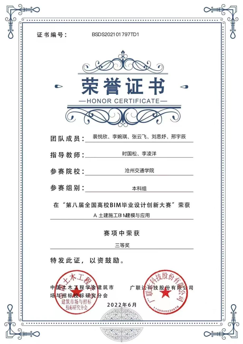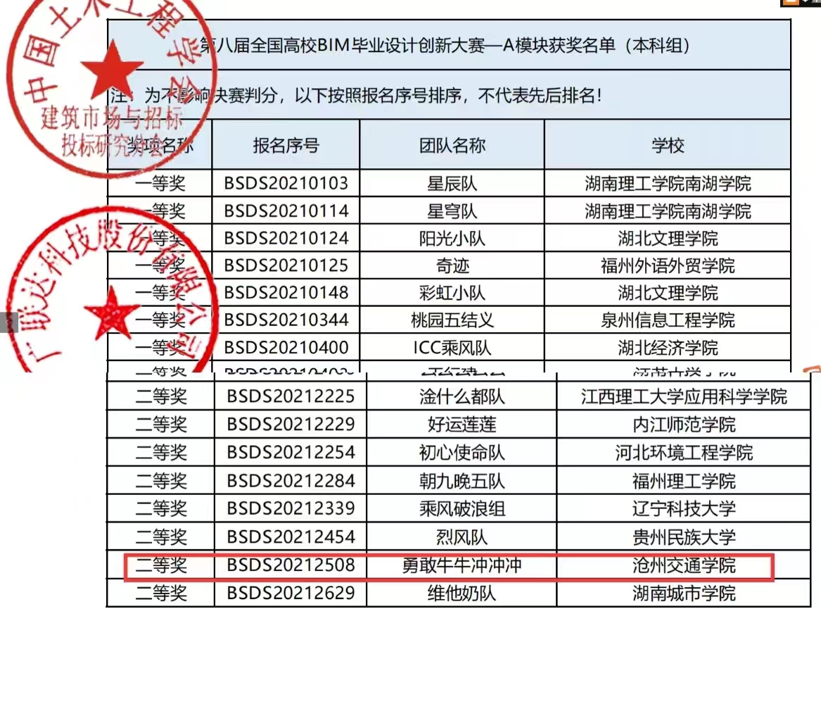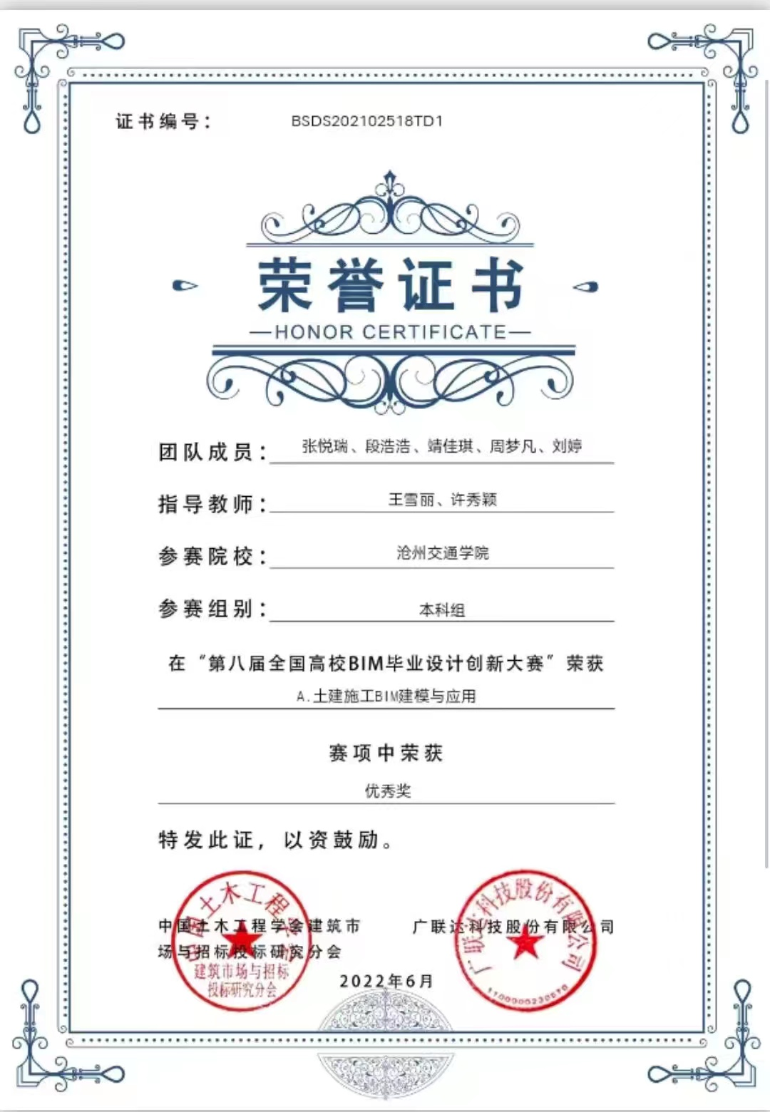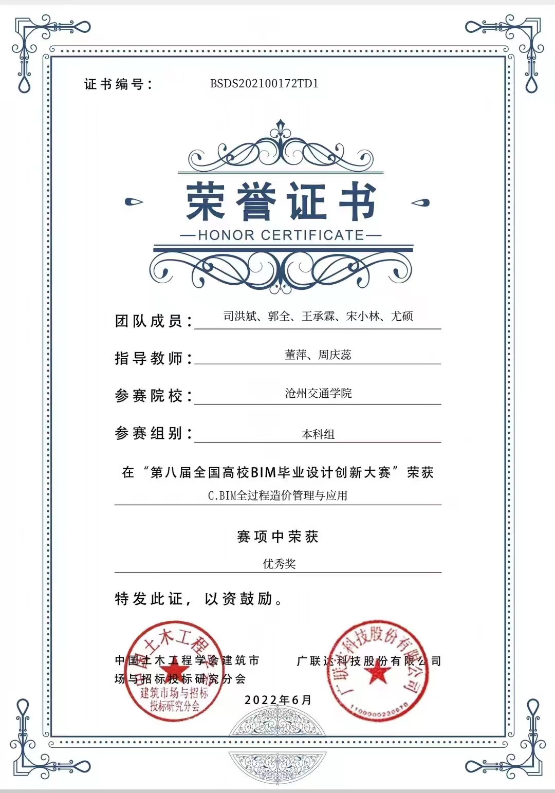 sunbet官网近日收到第八届全国高校BIM毕业设计创新大赛多项获奖证书。经济管理学院教师董萍、周庆蕊指导的团队“勇敢牛牛冲冲冲”荣获大赛二等奖,“沧交经管队”荣获大赛优秀奖;土木建筑工程学院教师时国松、李凌洋指导的团队“星海队”荣获大赛三等奖,教师王雪丽、许秀颖指导的团队“高级正能量”荣获大赛优秀奖。