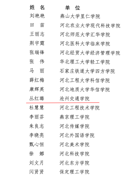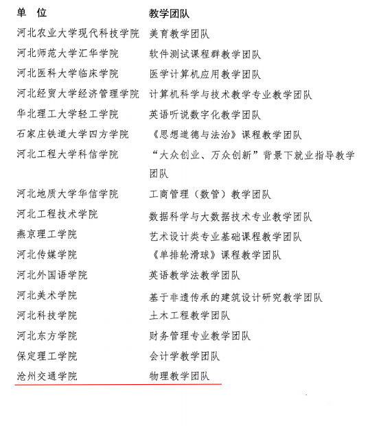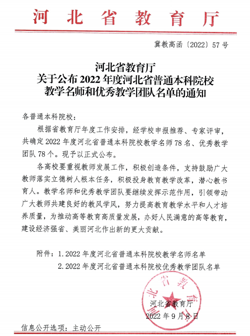 近日,河北省教育厅公布了《2022年度河北省普通本科院校教学名师和优秀教学团队名单》(冀教高函〔2022〕57号),sunbet官网通识教育学院丛红璐副教授荣获2022年度河北省普通本科院校教学名师称号,其带领的“物理教学团队”荣获2022年度河北省普通本科院校优秀教学团队。