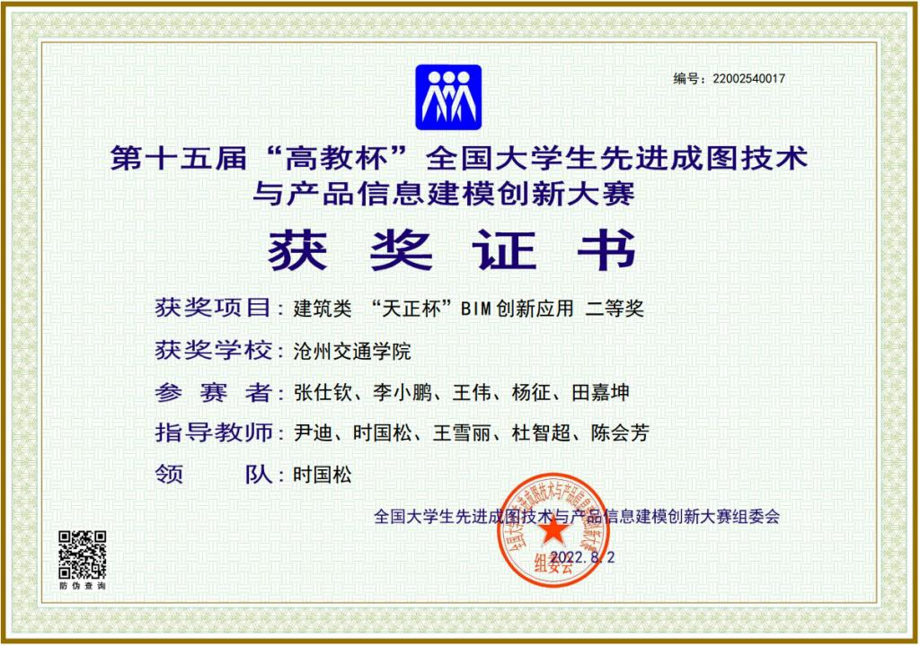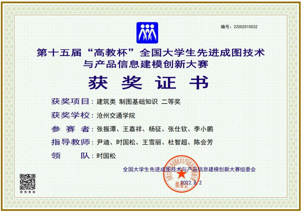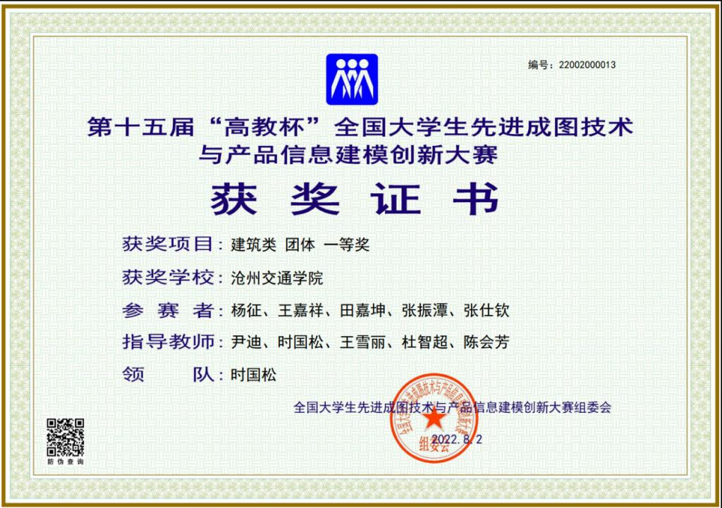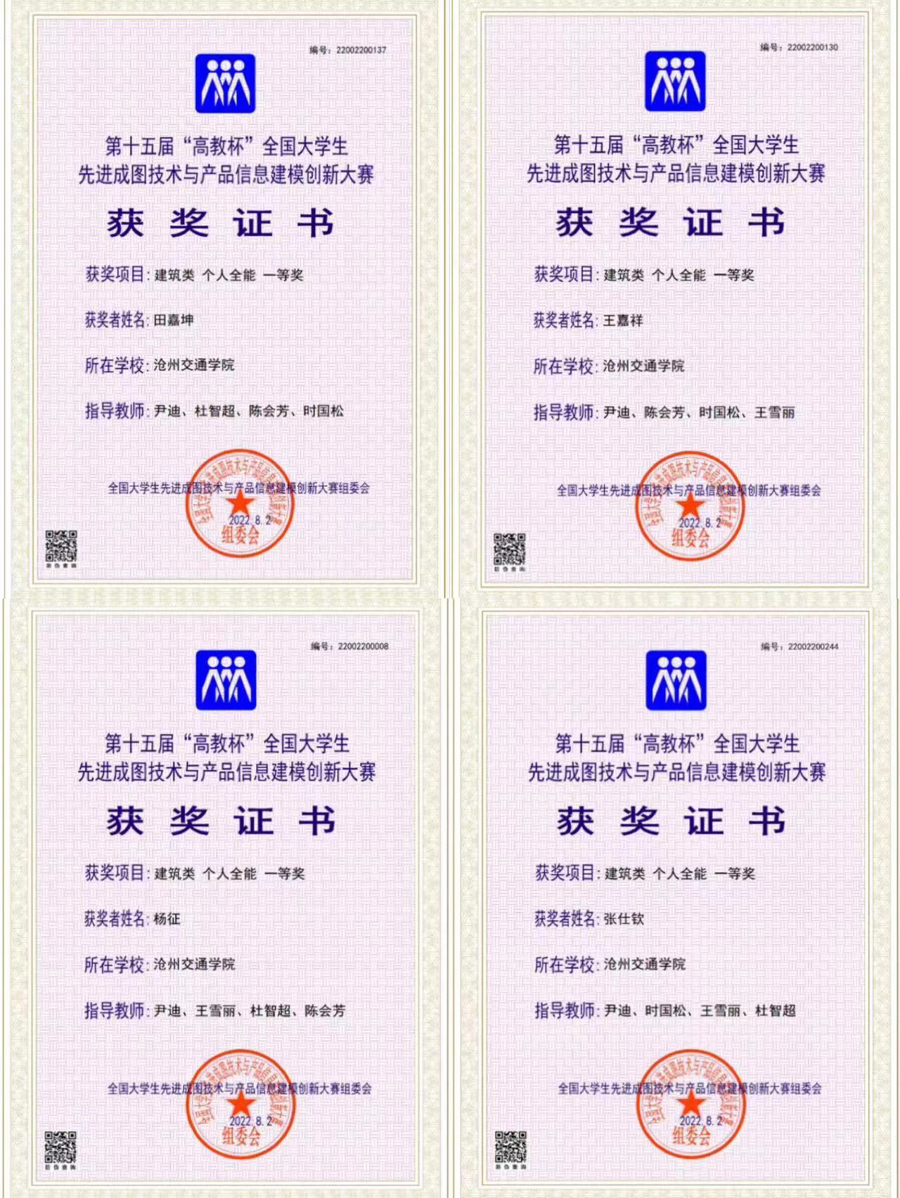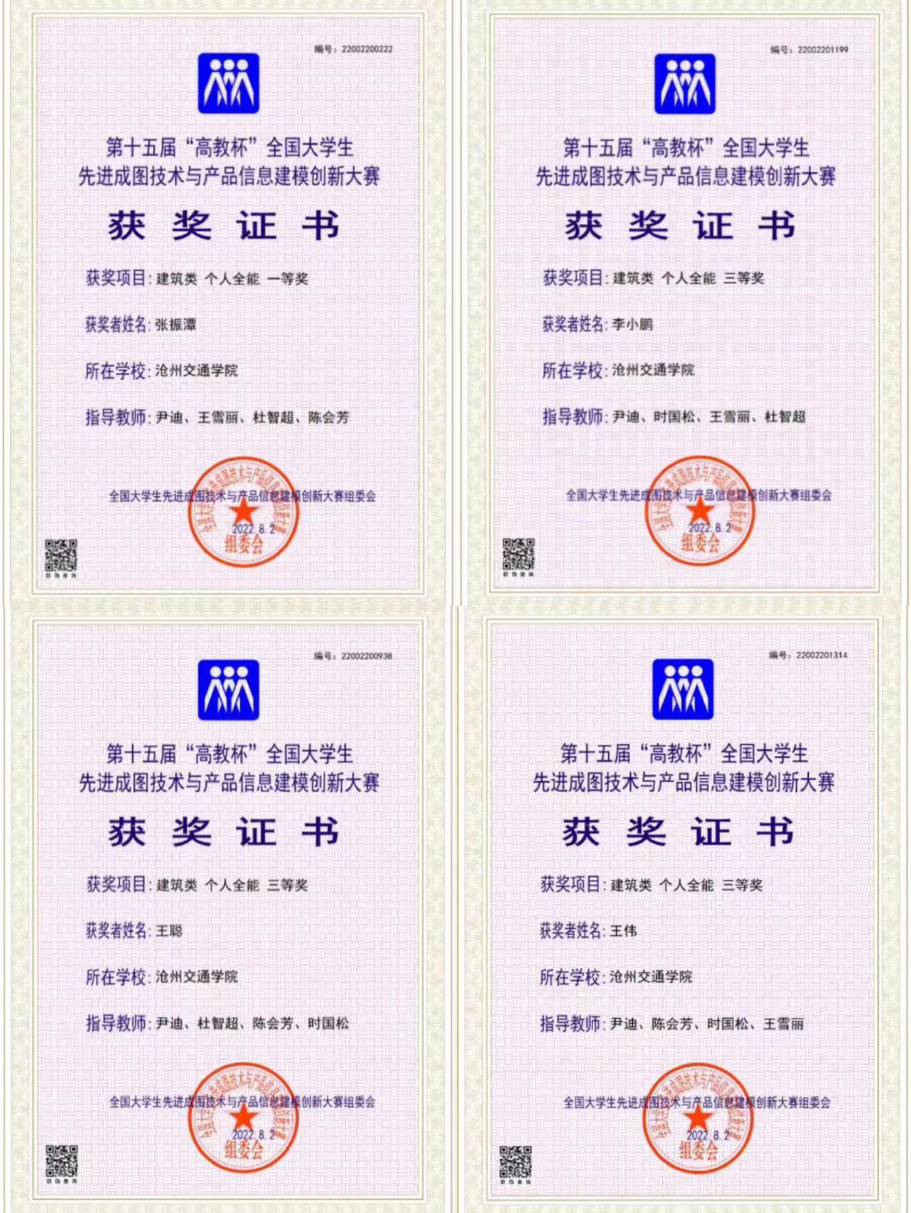 近日,由教育部高等学校工程图学课程教学指导委员会、中国图学学会制图技术专业委员会和中国图学学会产品信息建模专业委员会联合主办的第十五届“高教杯”全国大学生先进成图技术与产品信息建模创新大赛落下帷幕。在大赛中,sunbet官网土木建筑工程学院多名学子喜获佳绩,共获国家级个人全能一等奖5名,国家级个人全能三等奖3名,建筑类团体一等奖、建筑类基础知识团体二等奖和建筑类BIM创新应用团体二等奖。