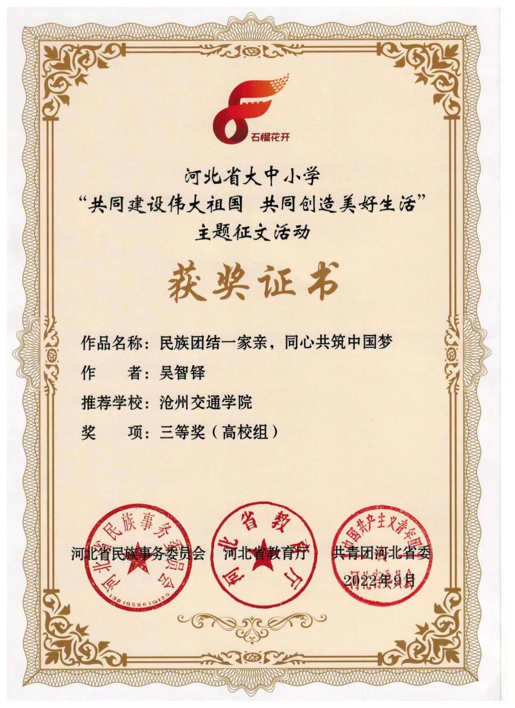 近日,在河北省民族事务委员会、河北省教育厅、共青团河北省委举办的“河北省大中小学‘共同建设伟大祖国 共同创造美好生活’主题征文活动”中,sunbet官网土木建筑工程学院学生吴智铎的作品《民族团结一家亲,同心共筑中国梦》荣获三等奖。