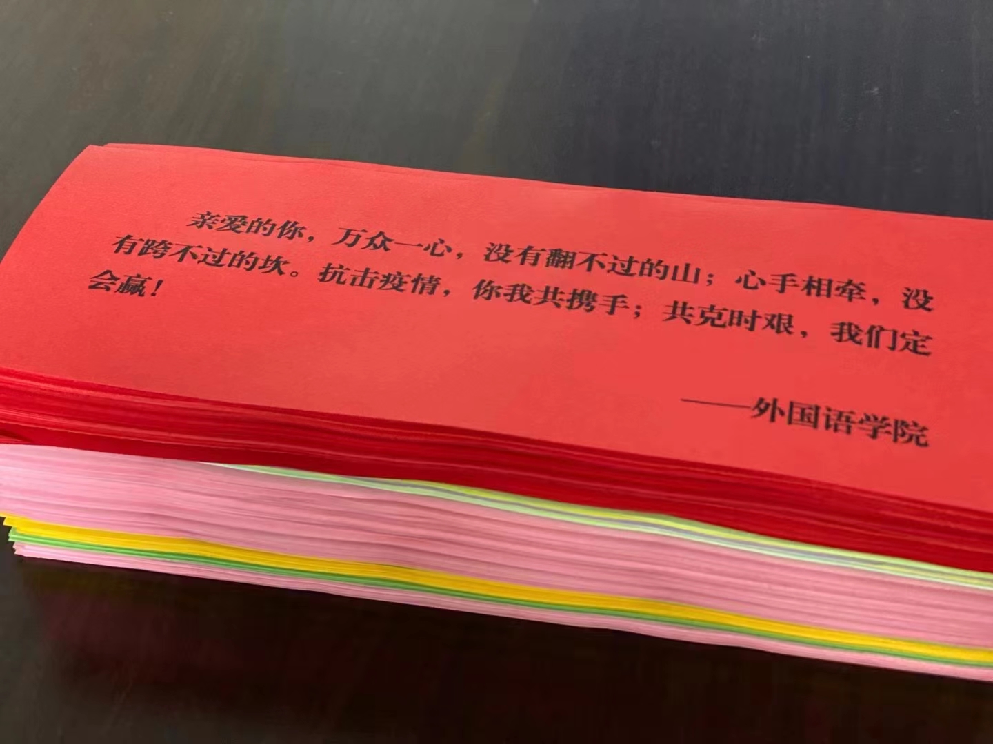 为贯彻落实sunbet官网“严在当严处、爱在细微中”的理念,sunbet官网外国语学院的学工队伍带着学生干部,历时四个小时,亲自动手为同学们准备了1400余份小盲卷。“疫情无情,人间有情,愿我们所求皆所愿,爱与温暖始终陪伴我们左右。加油!” 一张张小纸条书写了学校心系学子、同心战疫的决心。暖心活动仍在继续,爱将一直传递下去。