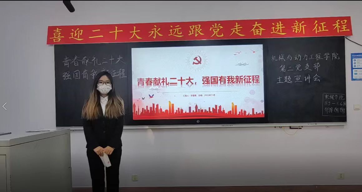 机械与动力工程学院第二党支部开展“青春献礼二十大,强国有我新征程”主题宣讲活动,支部成员录制宣讲视频,深刻阐释了党的二十大的核心要义,准确传达了党的二十大的精神实质。此次宣讲会主题鲜明、内容丰富、分析深刻、见解独到,为全面学习、全面把握、全面落实党的二十大精神提供了有力指引。