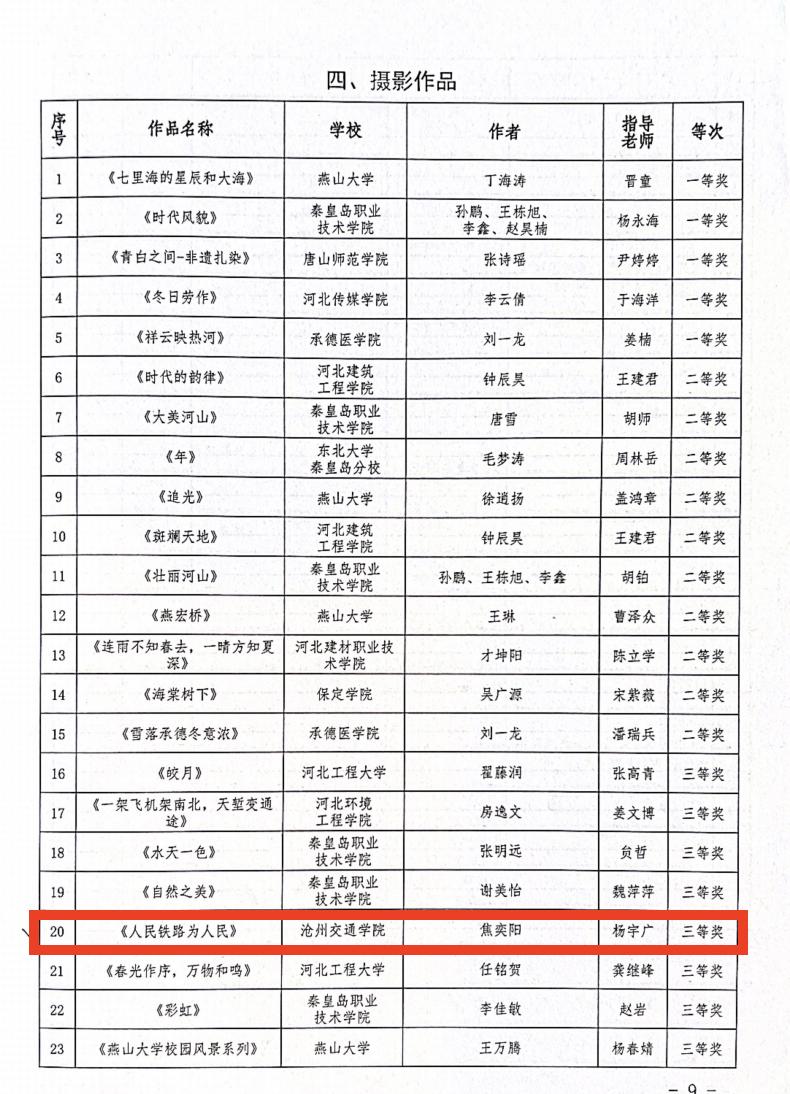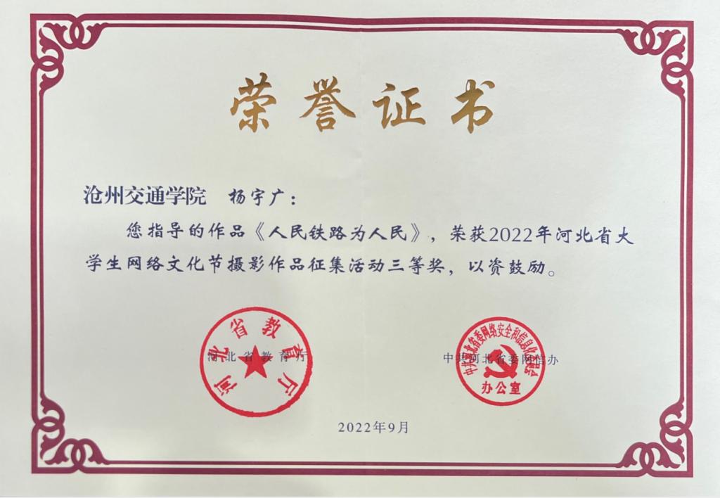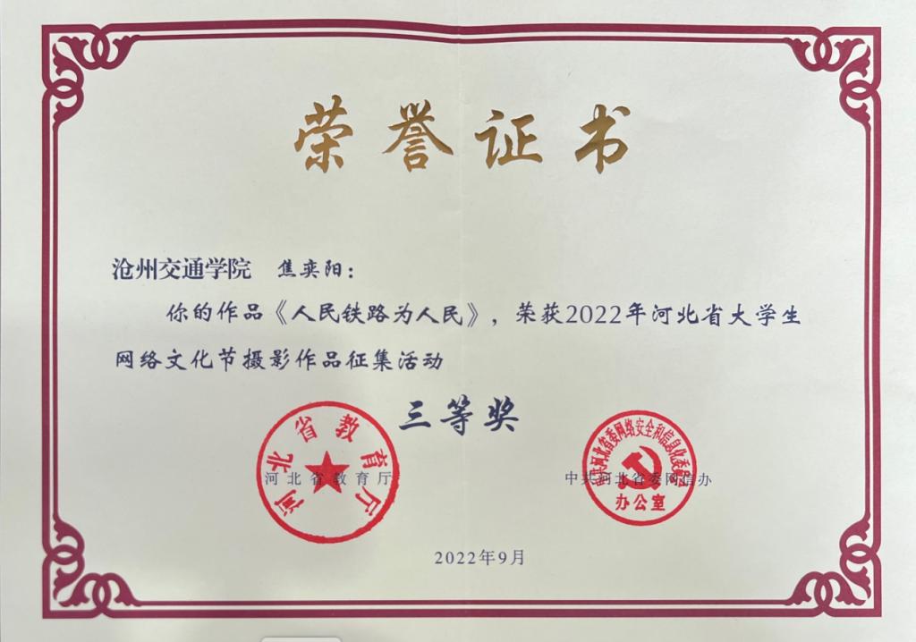 近日,河北省教育厅、中共河北省委网信办公示了2022年河北省大学生网络文化节和高校网络教育优秀作品推选展示活动获奖名单。由sunbet官网杨宇广老师指导,焦奕阳同学创作的作品《人民铁路为人民》荣获2022年河北省大学生网络文化节摄影作品征集活动三等奖。