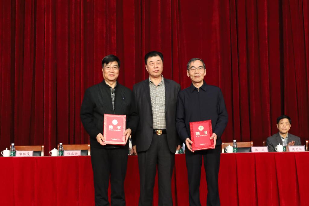 学校举办方融河(黄骅)科教有限公司总裁张在兴为章梓茂校长和张力顾问颁发聘书。