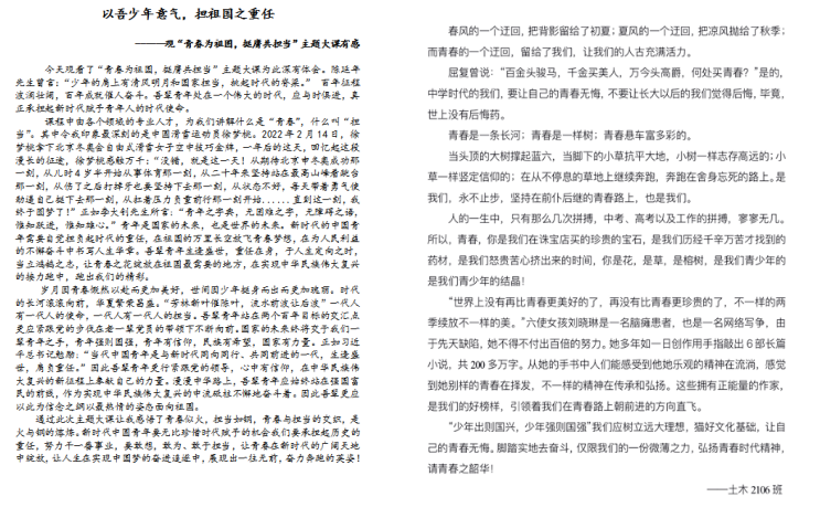 希望沧交学子通过本堂思政课把党的二十大精神内化于心、外化于行,能够坚定理想信念,怀揣伟大梦想,牢记习近平总书记嘱托,立志做有理想、敢担当、能吃苦、肯奋斗的新时代好青年。在全面建设社会主义现代化国家的新征程上一往无前、顽强拼搏,用青春和汗水推进中华民族伟大复兴,让明天的中国更美好!