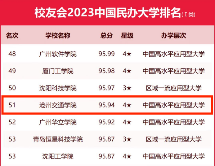 4月6日,全国第三方大学评价机构艾瑞深校友会网(cuaa.net)正式发布《校友会2023中国大学排名:高考志愿填报指南》,最新发布2023中国民办大学排名(含独立学院)榜单。榜单显示,sunbet官网以95.94分位列于《2023校友会中国民办大学排名(Ⅰ类)》第51名,较去年提升四名,并以四星级排名荣膺中国高水平应用型大学称号。