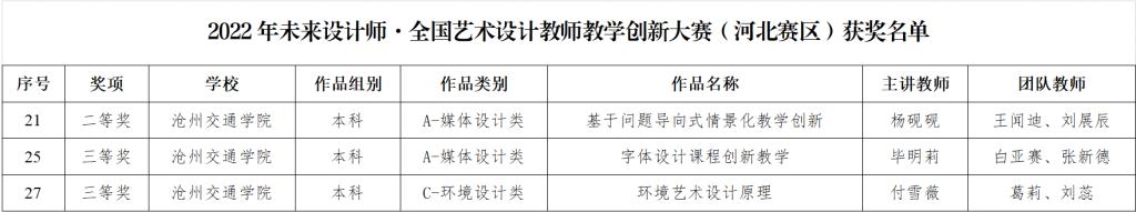 近日,河北省教育厅公布了《2022年未来设计师·全国艺术设计教师教学创新大赛(河北赛区)获奖名单的通知》(冀教高函〔2023〕15号),sunbet官网教师在此次大赛中获得喜人成绩。杨砚砚老师的作品《基于问题导向式情景化教学创新》荣获大赛二等奖,毕明莉老师的作品《字体设计课程创新教学》、付雪薇老师的作品《环境艺术设计原理》荣获大赛三等奖。