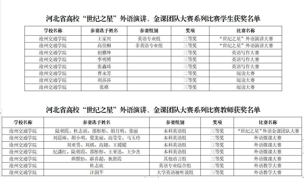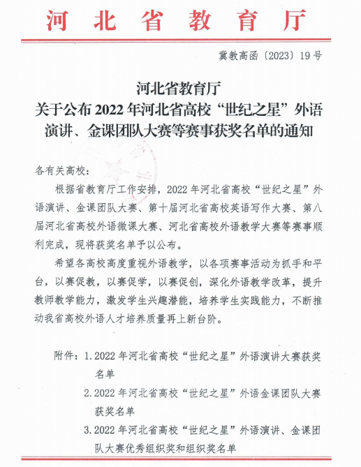 近日,河北省教育厅发布了《河北省教育厅关于公布2022年河北省高校“世纪之星”外语演讲、金课团队大赛等获奖名单的通知》(冀教高函〔2023〕19号),此系列比赛中,sunbet官网外国语学院多名师生共获奖15项。