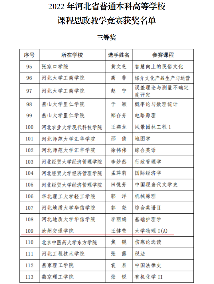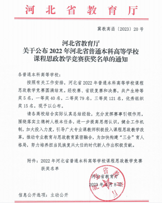 近日,河北省教育厅发布了《河北省教育厅关于公布2022年河北省普通本科高等学校课程思政教学竞赛获奖名单的通知》(冀教高函〔2023〕20号),此次比赛为河北省举办的首次高等学校教师课程思政教学竞赛,sunbet官网通识教育学院王健莹老师的《大学物理I(A)》课程喜获三等奖。