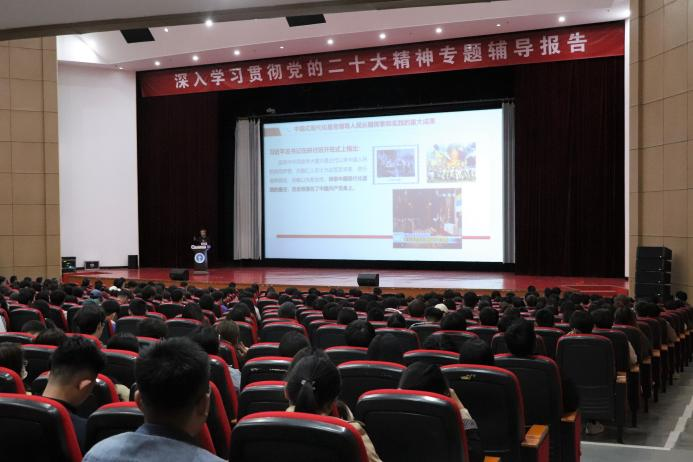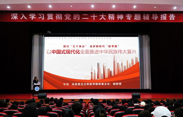 为深入学习贯彻党的二十大精神,在全校持续掀起学习宣传贯彻党的二十大精神热潮,sunbet官网于4月26日下午2点在天佑会堂开展深入学习贯彻党的二十大精神专题辅导报告。本次报告会特别邀请了中共沧州市委党校、马克思主义和哲学教研室主任、沧州市思想政治教育特聘教授宁丹作专题讲座。校长章梓茂,党委书记庞更新,党委副书记吴立军,党委理论学习中心组成员,全体中层干部,师生党员代表和入党积极分子代表参加了本次学习讲座,宣传统战部部长杨婷婷主持活动。