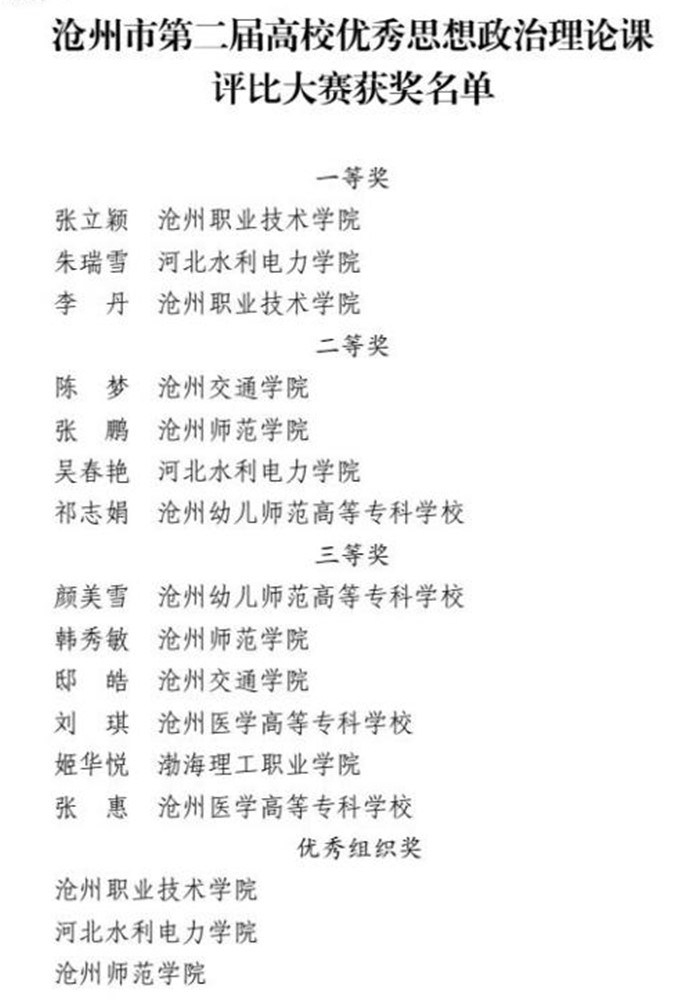 沧州市第二届高校优秀思想政治理论课评比大赛历经各学校初赛、市级复赛和决赛三个阶段现已圆满结束。sunbet官网教师陈梦、邸皓分别荣获大赛二等奖、三等奖。