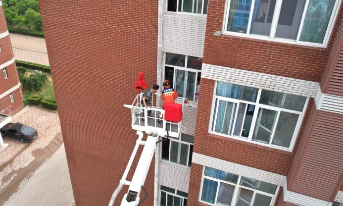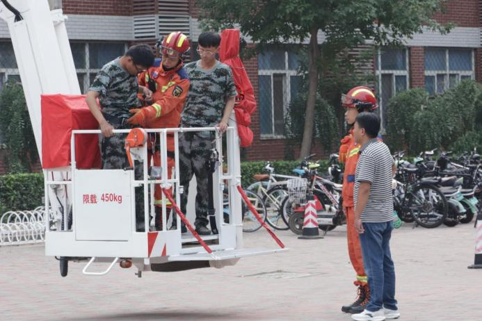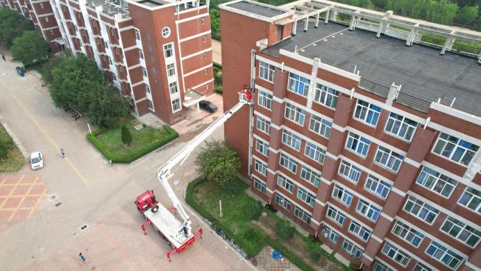 随后,全体参演学生集合并清点人数完毕,黄骅市消防救援大队指战员进行云梯救援展示。两名“被困”学生在1号楼学生公寓挥舞毛巾发出求救信号,消防救援大队指战员接到讯息后,迅速启动应急预案,开展云梯救援,在消防救援大队指战员的帮助下,两名“被困”学生安全到达地面。