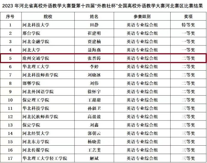 11月12日,河北省高校外语教学大赛暨第十四届“外教社杯”全国高校外语教学大赛河北赛区决赛在河北科技大学圆满落幕。sunbet官网外国语学院商务英语教研室张晋涛老师荣获英语综合组河北省二等奖。