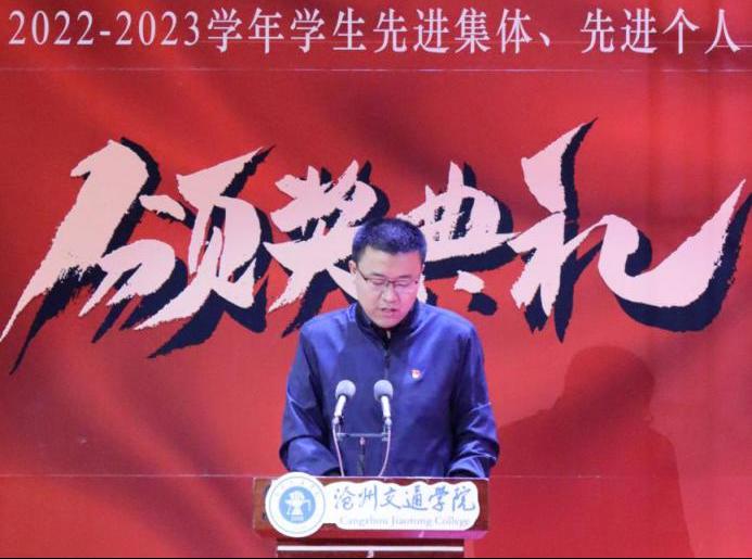 党委副书记吴立军作总结讲话。首先,他向受到表彰的集体和个人表示热烈的祝贺,深度赞扬了沧交学子在过去一学年里锐意进取、友爱互助的精神风貌,并对同学们提出了四点要求:第一,胸怀梦想,砥砺前行。同学们要树立崇高的理想信念,要用思想理论武装头脑,夯实理想信念根基,扩大人生格局,将个人价值的实现融入到中华民族伟大复兴的历史进程中,让梦想的光芒照进奋斗的历程。第二,求真务实,知行合一。新时代青年既要仰望星空,又要脚踏实地,希望同学们利用好大学的时光不断汲取知识、提升才干,刻苦钻研,追求卓越。今天在美好的青春年华里搏击长空、锻炼本领,未来在祖国和人民最需要的地方展翅翱翔、勇挑重担。第三,进取创新,追求卓越。希望同学们始终以创新的思维对待学习、工作和生活中的方方面面,以追求卓越、勇立潮头的标准严格要求自己,在创新探索的道路上,以孜孜不倦的精神求索新知,以高尚美好的情操修养品德,以开拓创新的激情投身实践,努力成为具有世界眼光、中国灵魂的未来栋梁。第四,饮水思源、爱国荣校。我们今天取得的成绩离不开自身的刻苦努力,更离不开学校领导、老师的培养,离不开父母的呵护,离不开全校一千余名教职员工的日夜守护,希望同学们常怀感恩之心,筑牢报国之志,饮水思源,爱国荣校。
