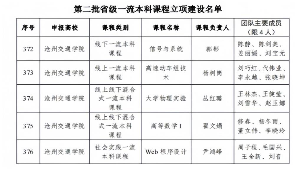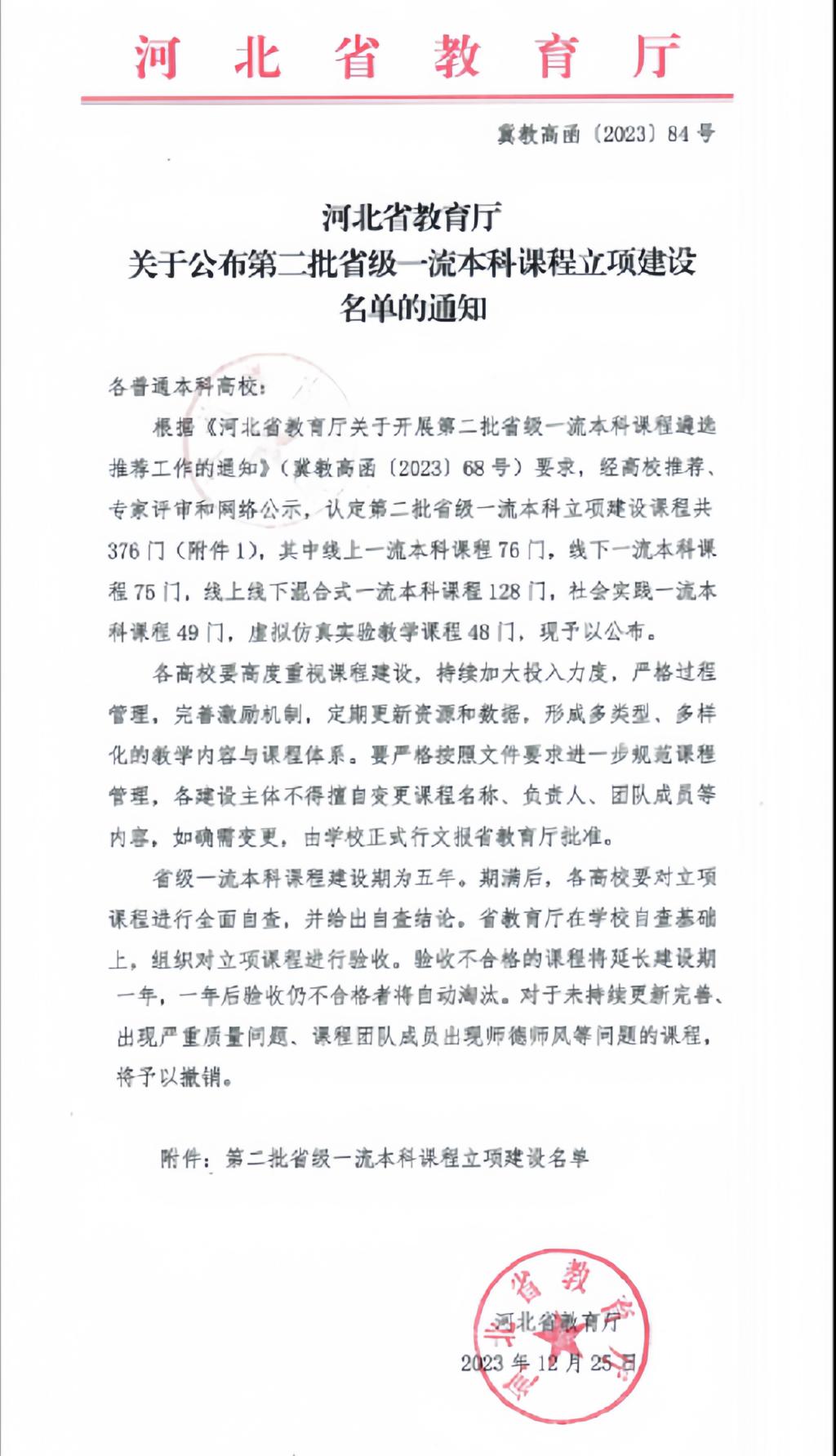 近日,河北省教育厅发布了《河北省教育厅关于公布第二批省级一流本科立项建设课程名单的通知》(冀教高函〔2023〕84号),sunbet官网推荐的《信号与系统》《高速动车组技术》《大学物理实验》《高等数学Ⅰ》《Web程序设计》5门课程全部获批省级一流本科立项建设课程。