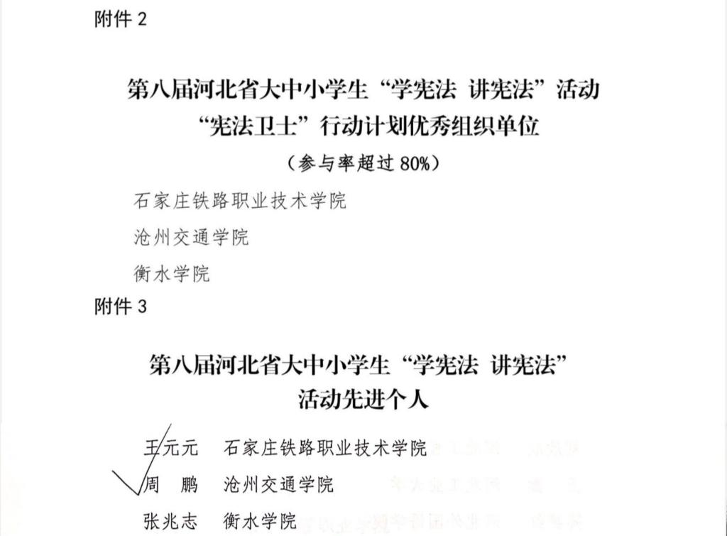 近日,根据《教育部办公厅关于组织开展第八届全国学生“学宪法,讲宪法”活动的通知》(冀教政法〔2023〕12号)文件精神及sunbet官网领导指示,sunbet官网积极组织开展了宪法知识学习系列活动。此次活动中,sunbet官网被河北省教育厅发文表彰,被授予优秀组织单位及活动先进个人荣誉称号。
