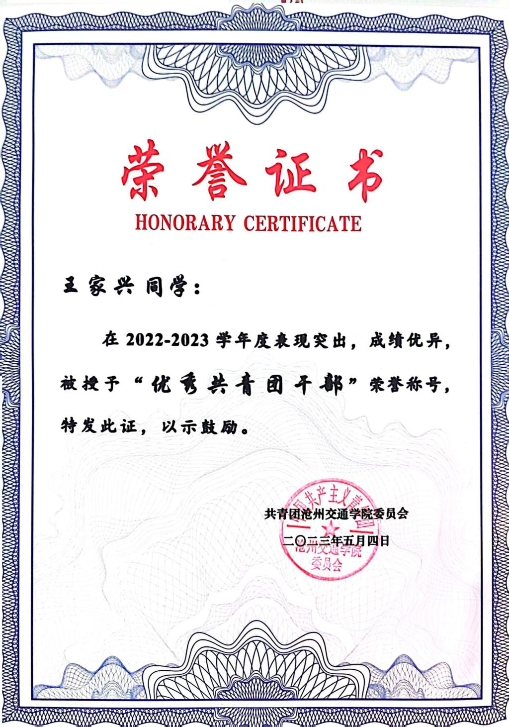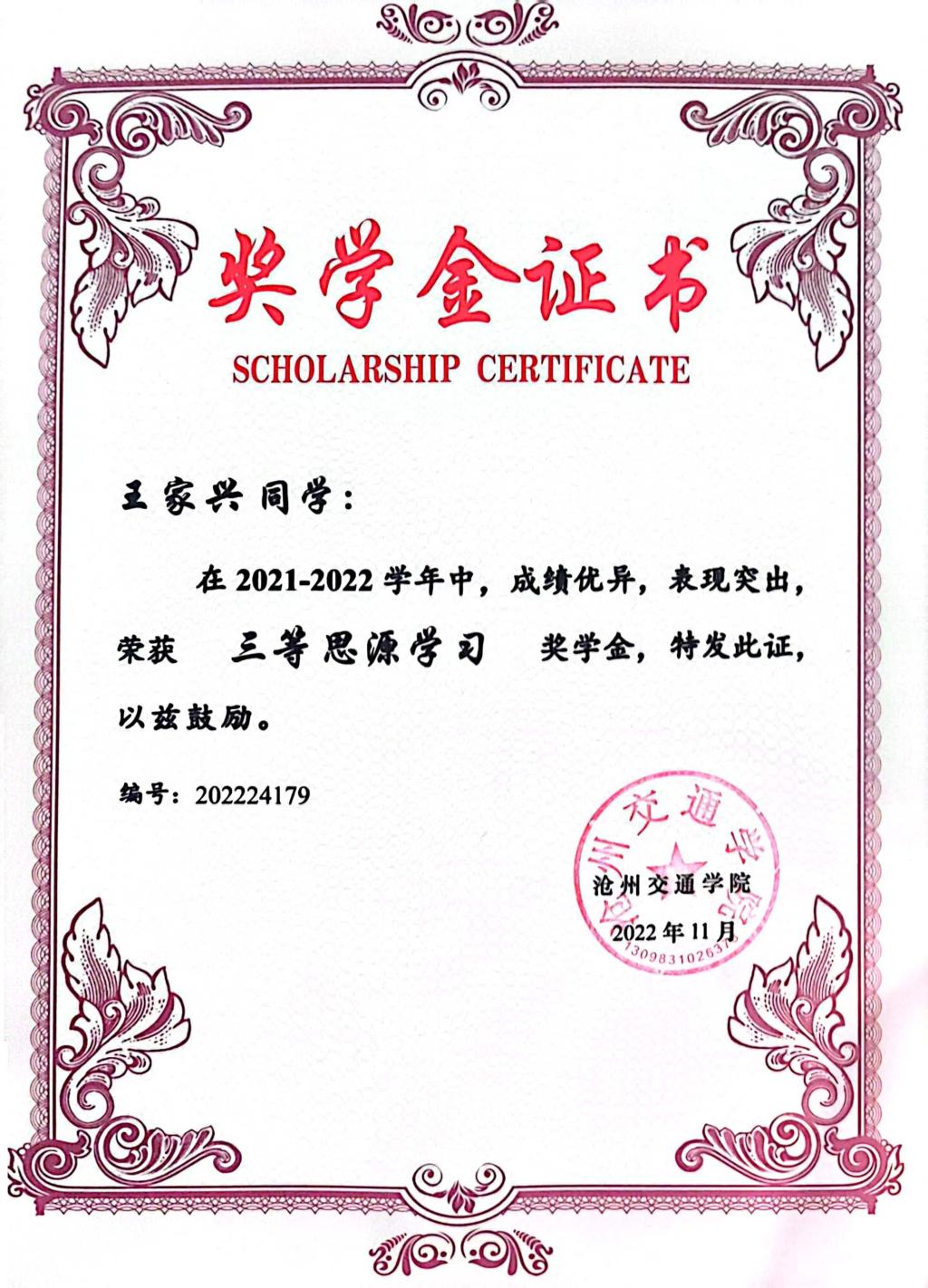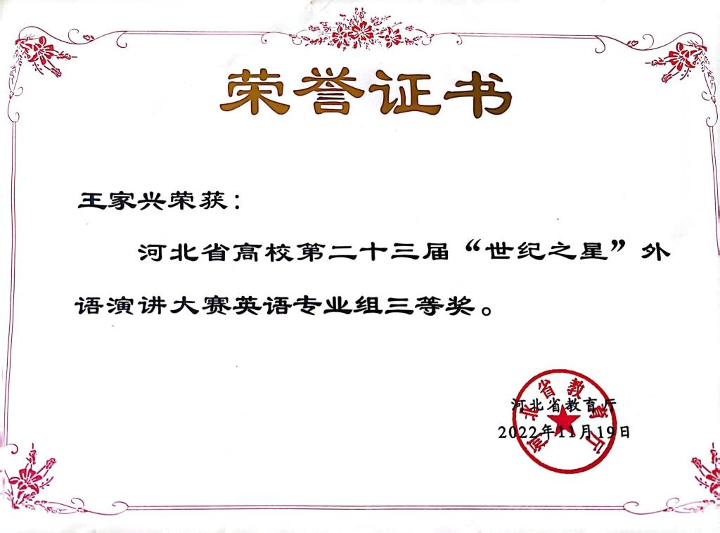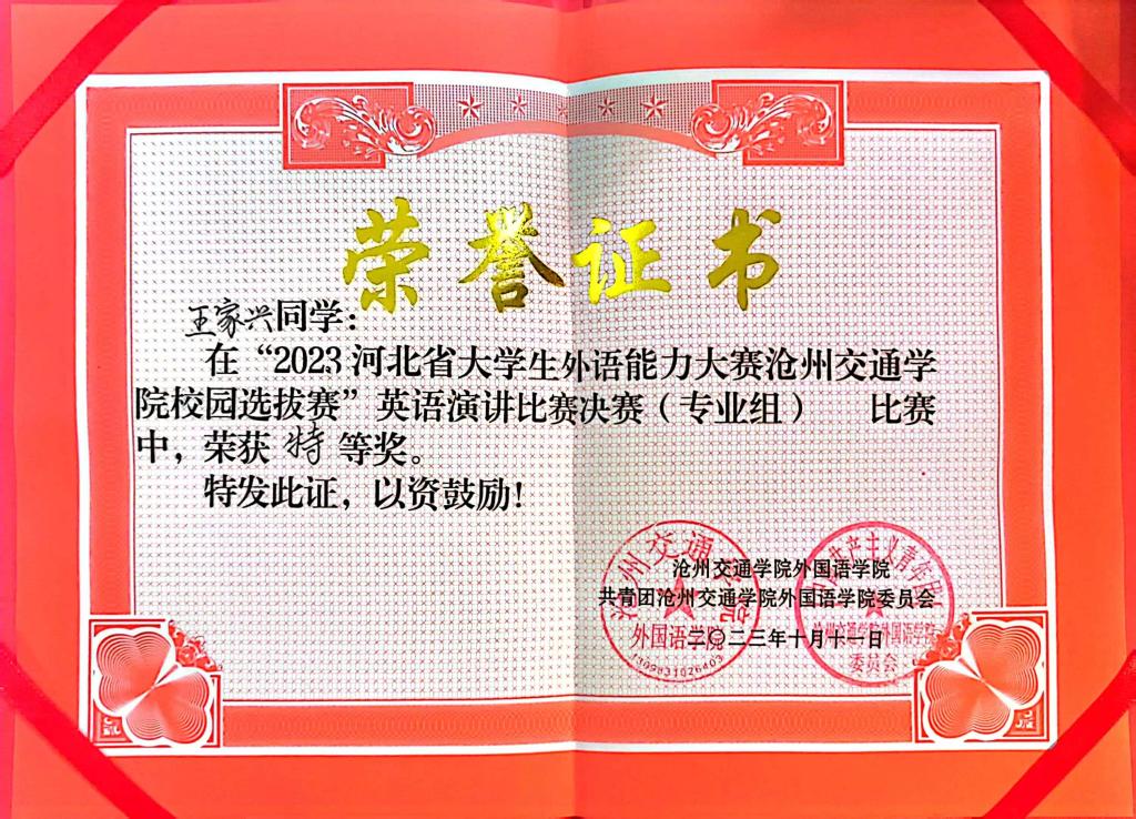 王家兴在学习上一直严于律己,平均绩点3.8,年级排名5.8%。他积极参与各项竞赛,荣获2022外研社国才杯暨第二十三届“世纪之星”英文演讲大赛河北省三等奖、2022年外研社国才杯暨“世纪之星”英文演讲大赛校选赛冠军特等奖、2023年外研社国才杯英文演讲大赛省级铜奖、2023研社国才杯暨“世纪之星”英文演讲大赛校选赛卫冕冠军ToastMasters最佳即兴演讲,2022年荣获思源学习奖学金,2023年荣获思源工作奖学金。