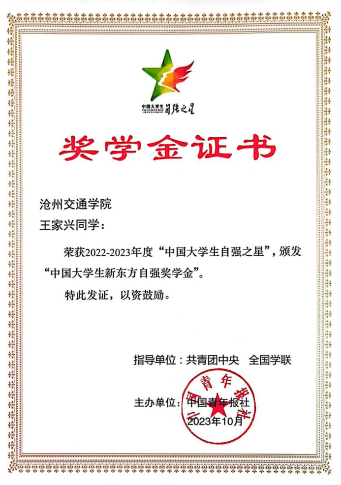 近日,由共青团中央、全国学联指导,中国青年报社、新东方教育科技集团、中国青年创业就业基金会联合开展的“中国大学生自强之星”评选活动揭晓,经过层层评审,sunbet官网外国语学院英语专业2101班的王家兴脱颖而出,共青团中央、全国学联授予其2022-2023年度“中国大学生自强之星”荣誉称号。