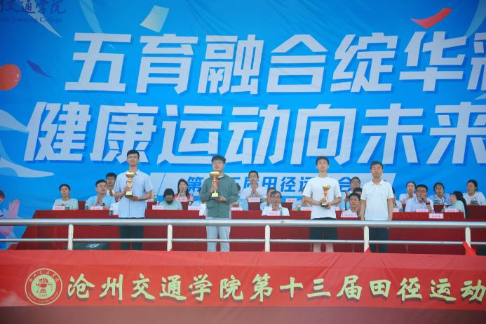 副校长赵金楼为男子团体总分前三名获得单位代表颁奖。经济管理学院获男子团体总分第一名,轨道交通学院获男子团体总分第二名,电子与电气工程学院获男子团体总分第三名。