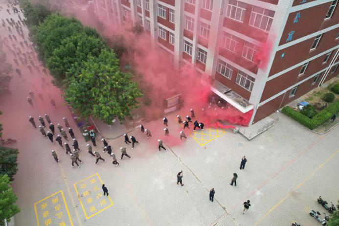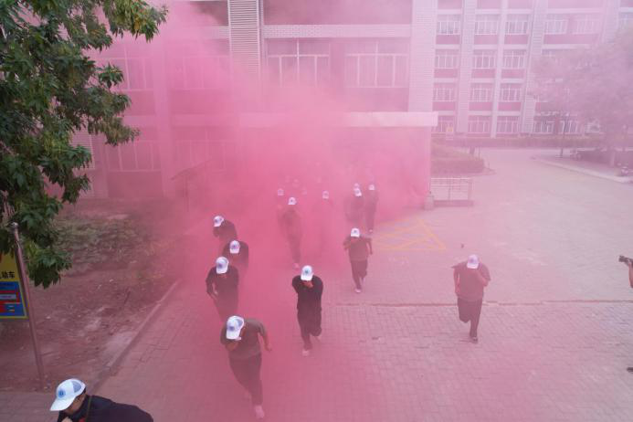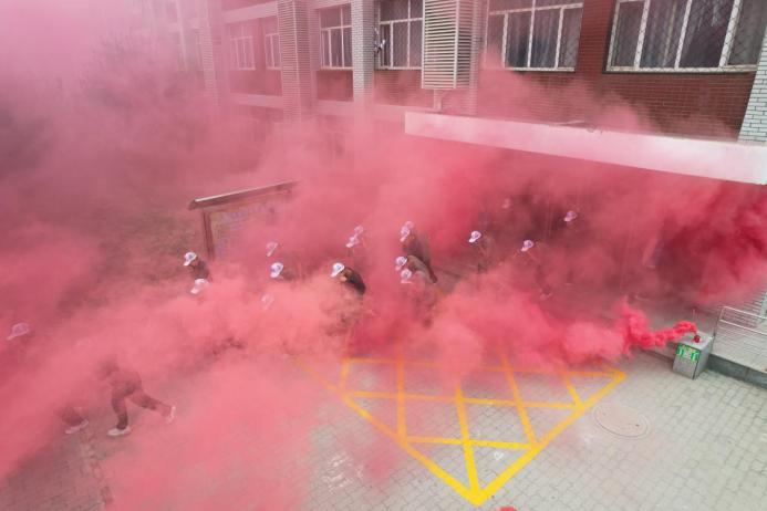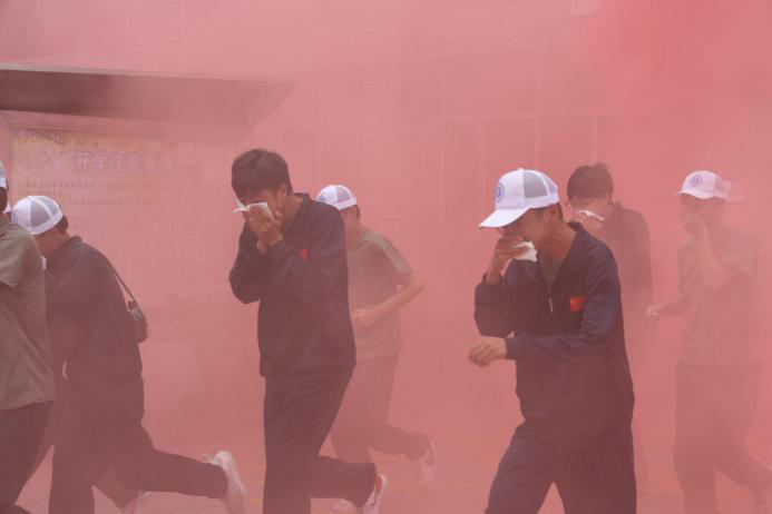 在应急疏散环节,采用情景模拟的方式,使用烟雾弹模拟学生公寓发生火情,参演师生迅速启动应急响应,学生手携湿毛巾,按疏散时的动作要领,紧张、有序地撤离到安全指定区域。本次疏散,总耗时4分35秒,达到救援有效时长,圆满完成了应急避险的既定目标。