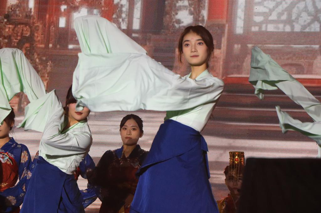 第一篇章绘青春之彩,展现了青年学子对美好生活的向往和对青春的赞美。器乐演奏《云宫迅音》展现中华音乐文化的深厚底蕴;歌曲《虞兮叹》古典与现代交融的动人旋律,唱出了青春的活力;古典舞蹈《唐宫夜宴》再现唐代宫廷的繁华与辉煌;相声《五官争功》妙趣横生,以幽默对话展现五官特色,令人捧腹大笑,尽显相声艺术独特魅力;歌曲《千里之外》旋律悠扬,歌声深情,让人沉浸在唯美故事中,感染力十足;《出水莲》舞蹈优美灵动,如莲花绽放,尽显柔美韵味,令人陶醉其中。