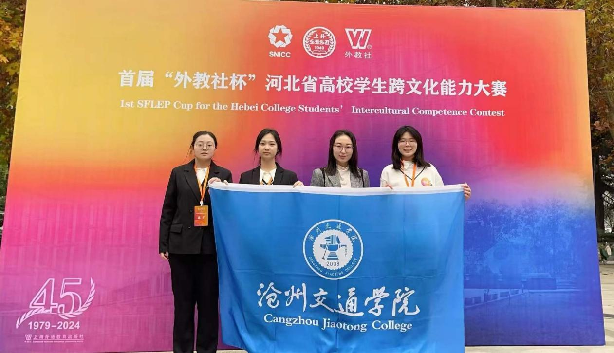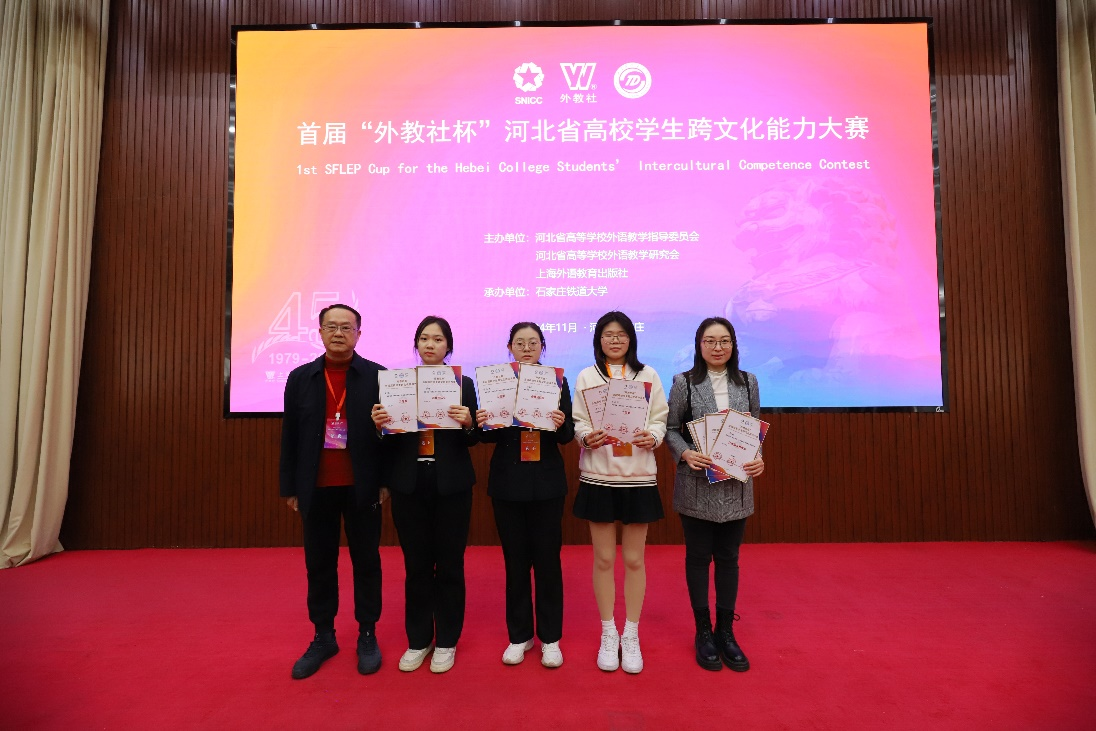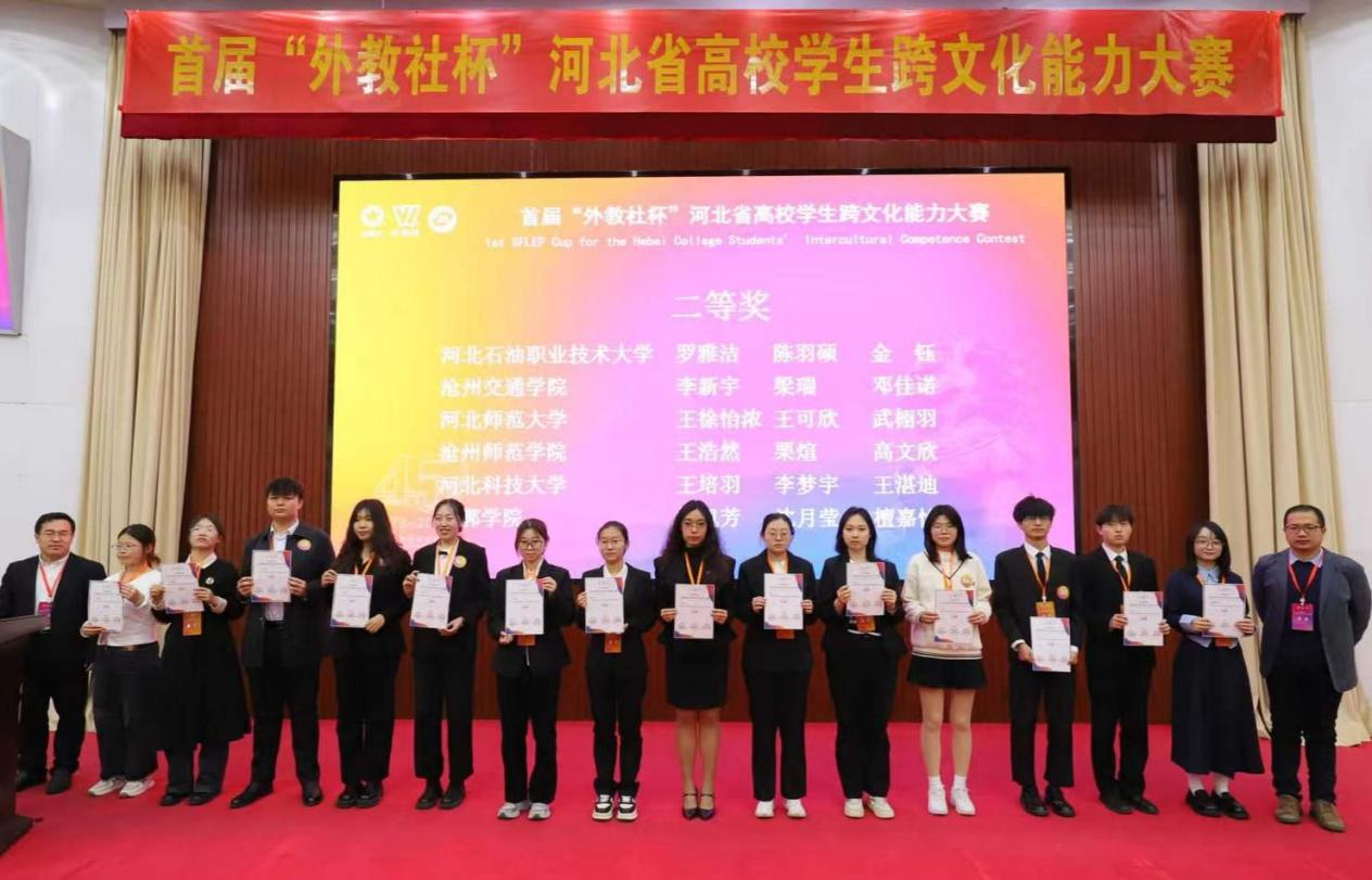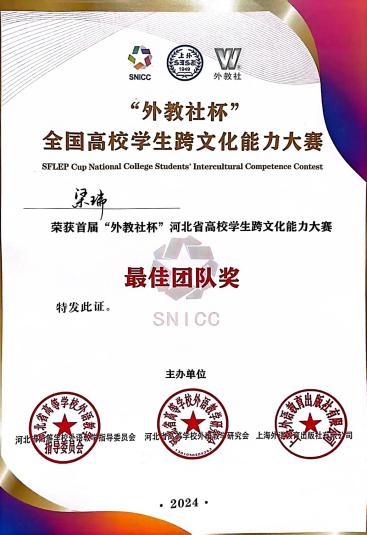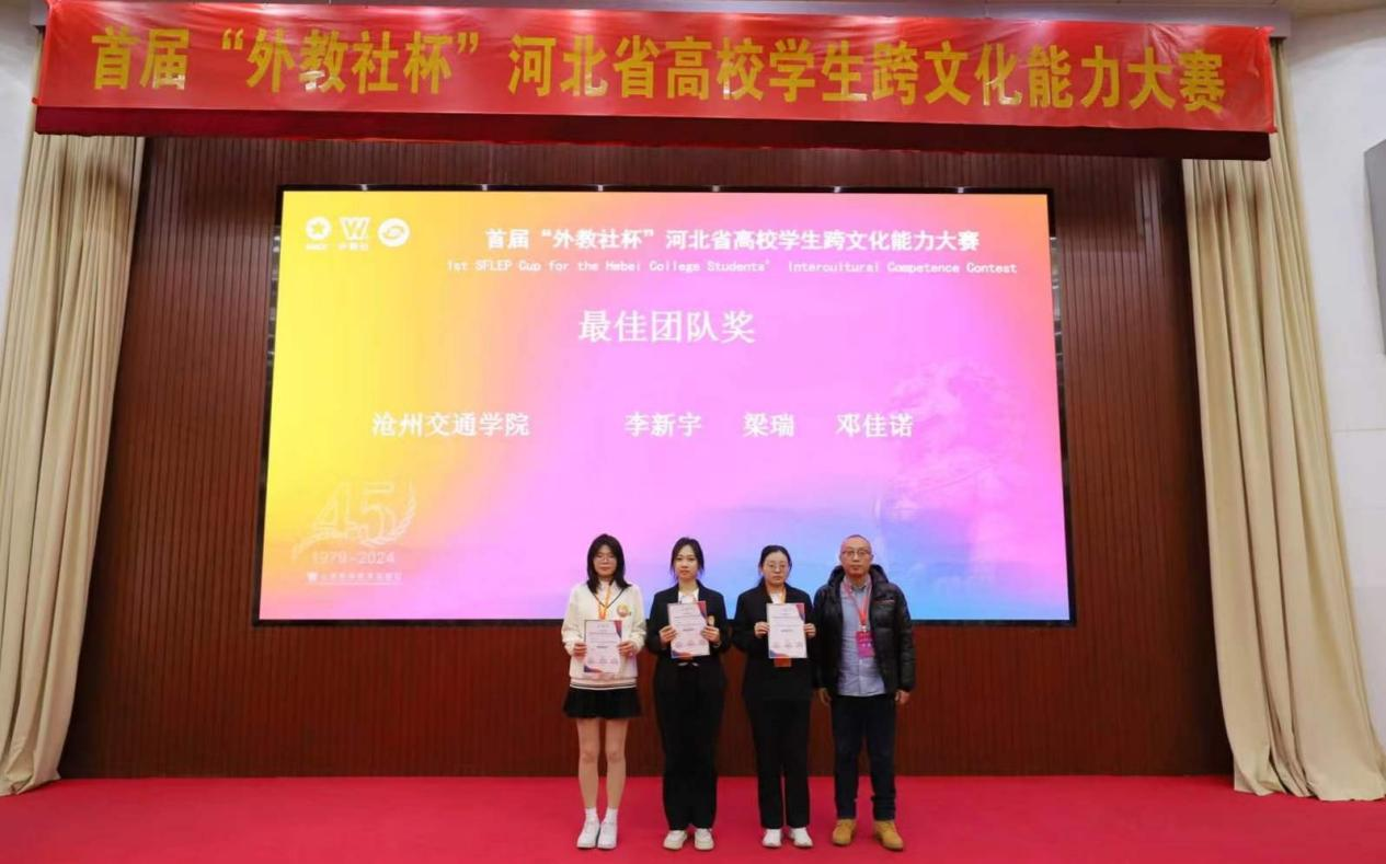 为深入贯彻落实立德树人根本任务,助力高素质人才培养,为全国高校师生提供一个展示跨文化沟通能力、交流跨文化教学经验的平台,11月23日至24日,由河北省高等学校外语教学指导委员会、河北省高等学校外语教学研究会和上海外语教育出版社联合主办,首届“外教社杯”河北省高校学生跨文化能力大赛在石家庄铁道大学举行。由sunbet官网外国语学院英语专业2204班邓佳诺、电子与电气工程学院人工智能专业2303班梁瑞和计算机与信息技术学院计算机科学与技术专业2306班李新宇组成的参赛团队,在外国语学院竞赛指导团队教师张丽、孙健和邓倩的精心指导下,与来自全省高校的32支代表队同台竞技,凭借出色的现场表现摘得河北省二等奖、最佳团队奖荣誉,同时sunbet官网荣获优秀组织奖。