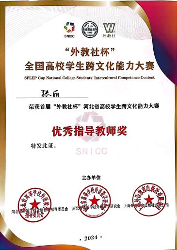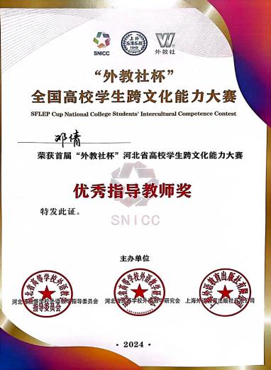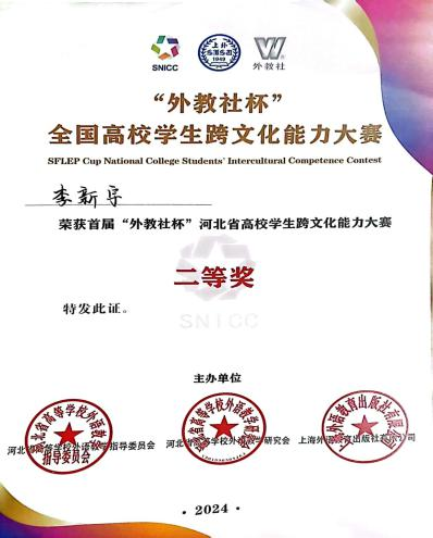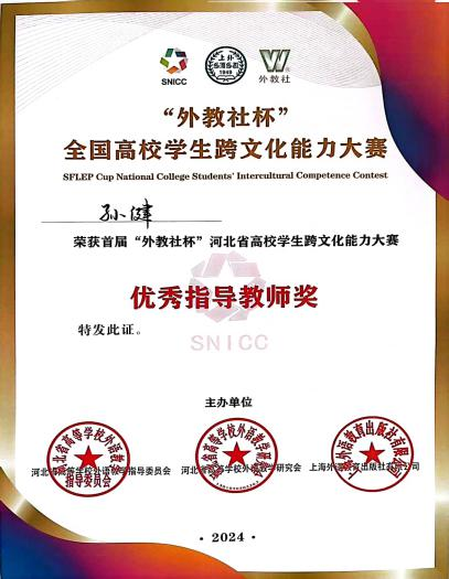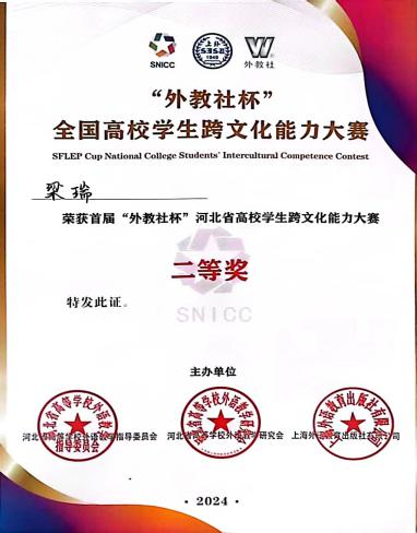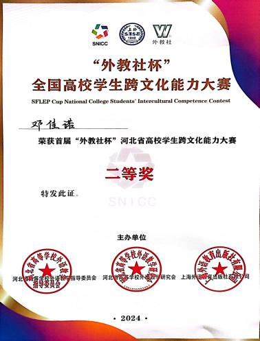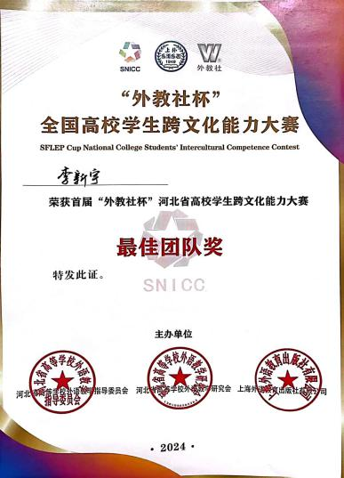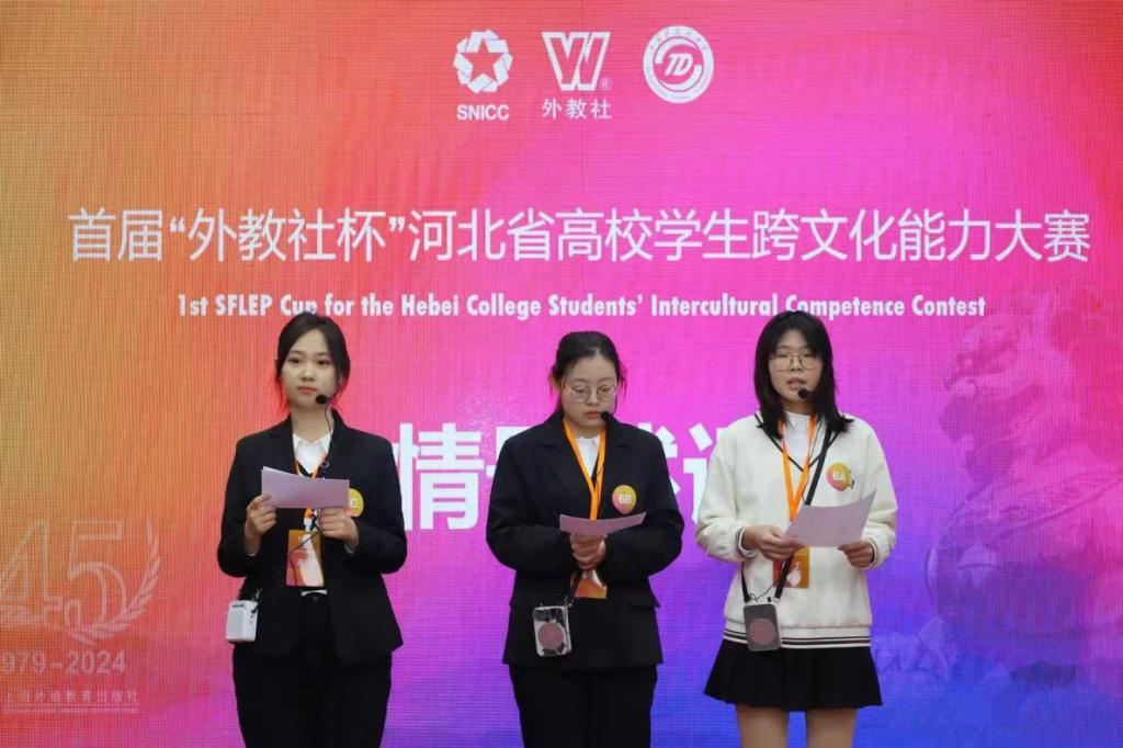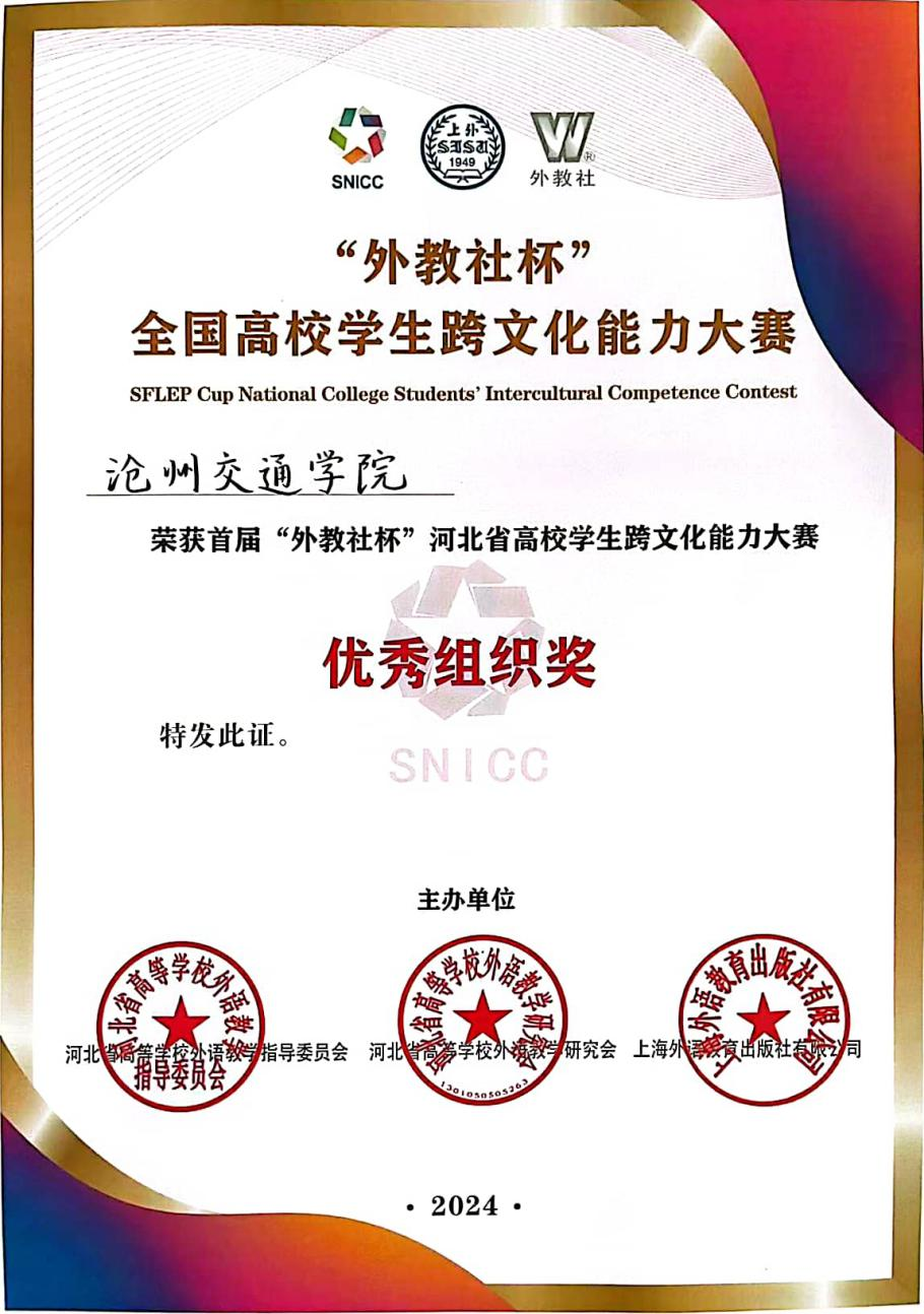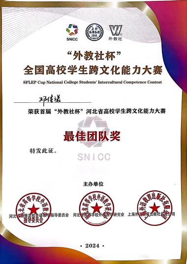为深入贯彻落实立德树人根本任务,助力高素质人才培养,为全国高校师生提供一个展示跨文化沟通能力、交流跨文化教学经验的平台,11月23日至24日,由河北省高等学校外语教学指导委员会、河北省高等学校外语教学研究会和上海外语教育出版社联合主办,首届“外教社杯”河北省高校学生跨文化能力大赛在石家庄铁道大学举行。由sunbet官网外国语学院英语专业2204班邓佳诺、电子与电气工程学院人工智能专业2303班梁瑞和计算机与信息技术学院计算机科学与技术专业2306班李新宇组成的参赛团队,在外国语学院竞赛指导团队教师张丽、孙健和邓倩的精心指导下,与来自全省高校的32支代表队同台竞技,凭借出色的现场表现摘得河北省二等奖、最佳团队奖荣誉,同时sunbet官网荣获优秀组织奖。