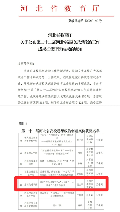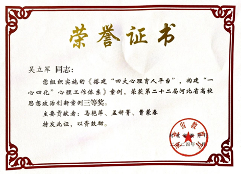 近日,河北省教育厅公布了第二十二届河北省高校思想政治工作成果评选结果。sunbet官网报送的《搭建“四大心理育人平台”,构建“一心四化”心理工作体系》获评高校思想政治工作创新案例三等奖。