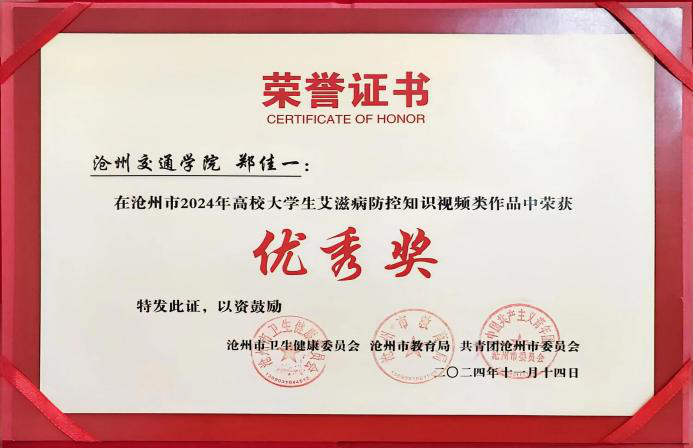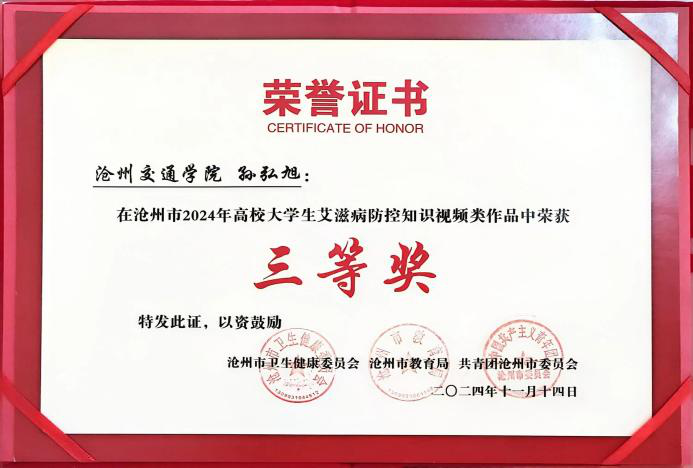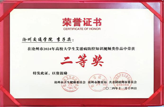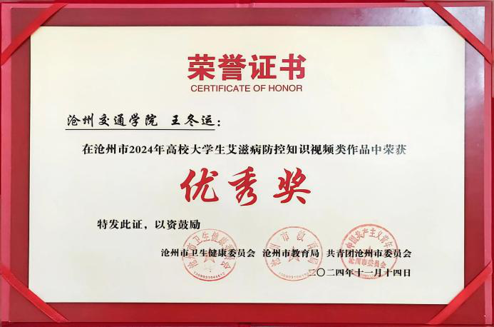 sunbet官网学子积极参与沧州市2024年高校大学生艾滋病防控知识作品征集,并取得了优异成绩。王欣怡同学、李子奕同学荣获视频类二等奖,孙弘旭同学荣获视频类三等奖,王冬运同学、郑佳一同学荣获视频类优秀奖。