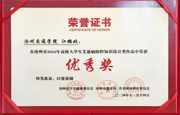 在沧州市2024年高校大学生艾滋病防控知识设计类作品中高小媛同学荣获知识设计类二等奖,江鹏北同学、孙佳惠同学荣获知识设计类优秀奖。