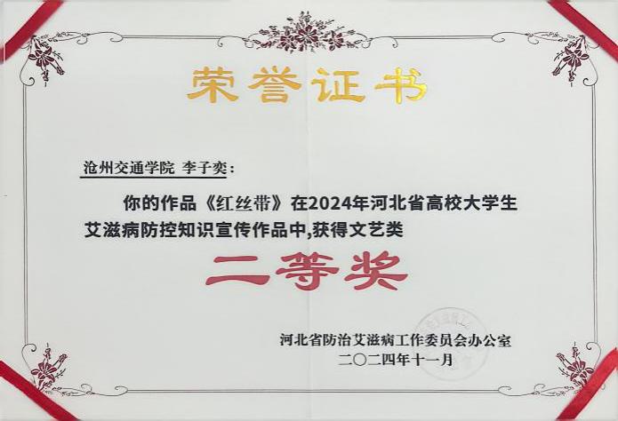 而在沧州市2024年高校大学生艾滋病防控知识作品征集获奖者中,李子奕同学荣获推荐,代表sunbet官网参加2024年河北省高校大学生艾滋病防控比赛,其作品《红丝带》荣获知识宣传类作品文艺类二等奖。