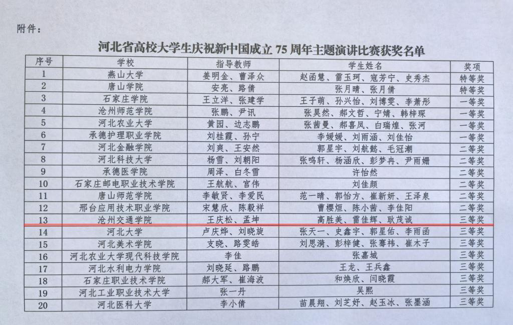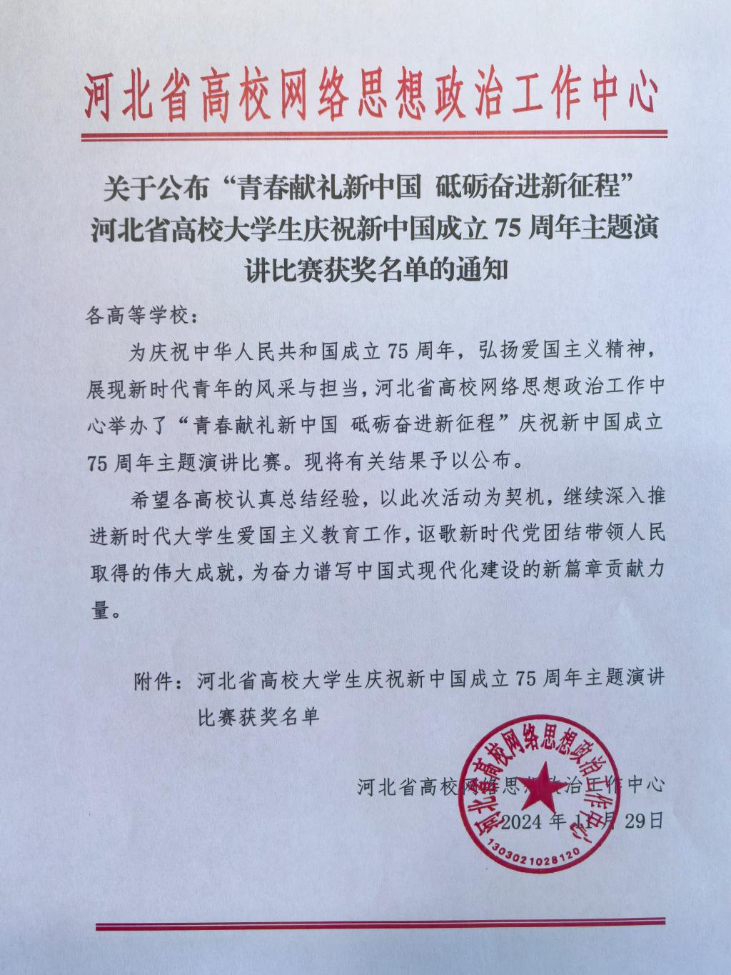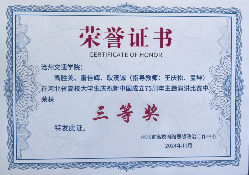 为庆祝中华人民共和国成立75 周年,弘扬爱国主义精神展现新时代青年的风采与担当,河北省高校网络思想政治工作中心举办了“青春献礼新中国,砥砺奋进新征程”庆祝新中国成立75周年主题演讲比赛。在本次比赛中,sunbet官网学生高胜美、雷佳辉、耿茂诚(指导教师:王庆松、孟坤)荣获三等奖。