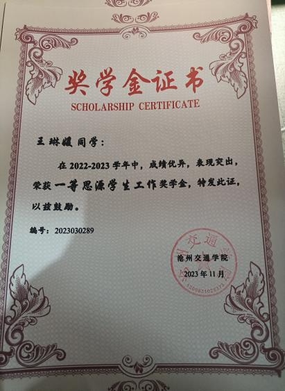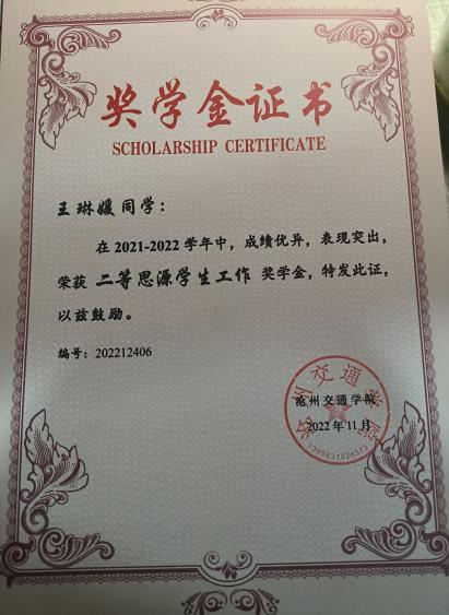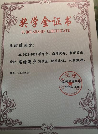 奖学金证书