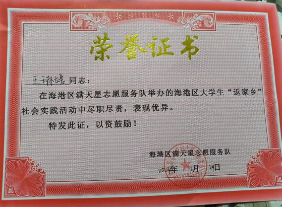 在返家乡社会实践实习期间她表现优秀,得到了实践单位领导和同事的一致认可,并获得了返家乡社会实践先进个人称号。