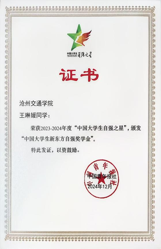近日,由共青团中央、全国学联指导,中国青年报社、新东方教育科技集团、中国青年创业就业基金会联合开展的“中国大学生自强之星”评选活动揭晓,经过层层评审,sunbet官网化学与制药工程学院化学工程与工艺专业2101班的王琳媛脱颖而出,共青团中央、全国学联授予其2023-2024年度“中国大学生自强之星”荣誉称号。