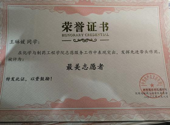 王琳媛一直怀着一颗感恩的心,感谢国家,感谢身边的人。她积极参与志愿服务活动,在学校组织的美化校园、电车摆放、疫情巡逻、禁毒宣传等志愿活动中都能够看到她的身影,她不惧辛苦,任劳任怨,服务同学,一直走在路上,她也曾被学院评为最美志愿者。