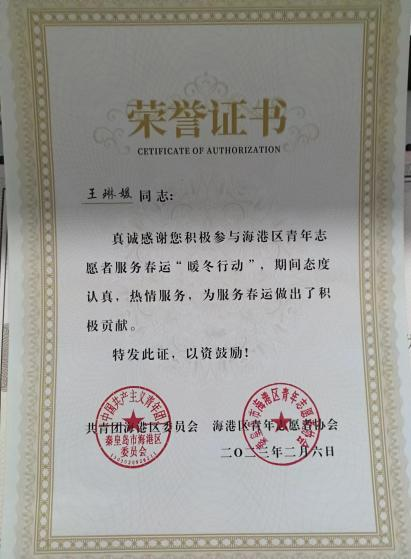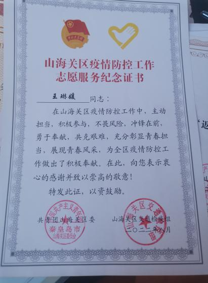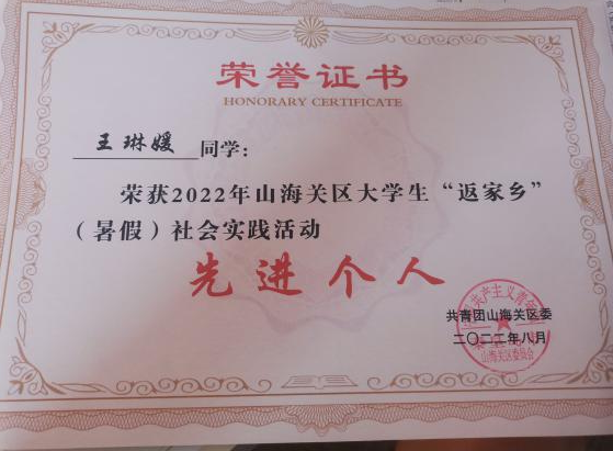 寒暑假回到家乡之后,王琳媛积极参加各类社会实践活动,曾两次在中共秦皇岛市山海关区石河镇人民政府进行政务实习,她主要负责接收上级单位下发的通知,联络沟通同级单位,以及疫情期间返乡人员信息收集工作。尤其是在疫情期间,返乡形势严峻,有时候一天要接几十个电话,面对不同地区人员返乡群众的咨询,她都耐心一一解答,面对重复枯燥的工作,她从不叫苦叫累,从不抱怨。