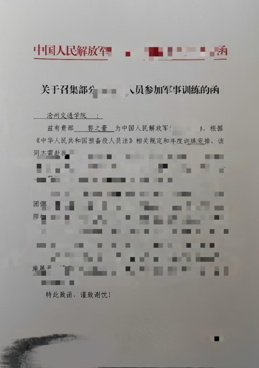 信中写道:“郭之豪训练期间刻苦耐劳、表现优秀,既充分体现了该同志的军旅情怀和‘若有战、召必回’的使命担当,同时也充分反映了贵单位对部队建设发展的大力支持,对国防事业的关心热情,展现了贵单位人员良好的素质。”