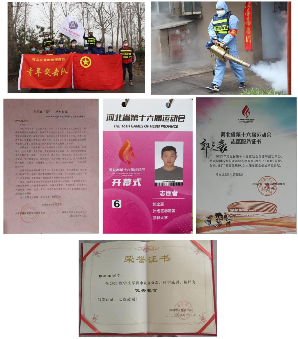 郭之豪,机械工程(专升本)2403班学生,现担任班级团支书。2021年,他积极响应国家号召,投身军旅。在服役期间,他表现卓越,多次出色完成任务,获得嘉奖。退役归校之后,他继续发扬军人作风,担任2023年3月入伍新兵役前训练教官,并荣获“优秀教官”称号。在校期间他积极投身志愿活动,疫情期间作为社区志愿者参与防疫工作,同时还参与蓝天救援队的社区消杀活动。此外,他还担任了河北省第十六届运动会志愿者,展现了当代青年服务社会、回报社会的责任与担当。