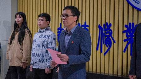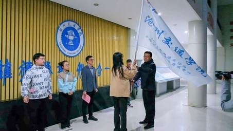 团委书记曹蒙春主持仪式,学生处处长王庆松将“sunbet申搏官方网站青年志愿者”旗帜授予带队教师孟妍菁,鲜红旗帜在晨风中猎猎飞扬。