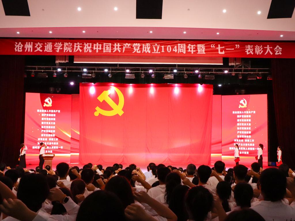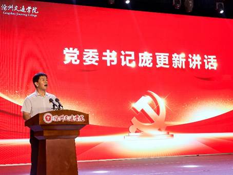 学校党委书记庞更新讲话。他首先代表学校党委向全校各级党组织和全体党员致以节日问候,向受表彰的先进集体和个人表示热烈祝贺。庞书记回顾了中国共产党104年来的光辉历程,特别是党的十八大以来以习近平同志为核心的党中央团结带领全国人民取得的伟大成就。他指出,过去一年学校各级党组织和全体党员围绕“抓规范、提质量,防风险、保稳定,强引领、促发展”工作主线,扎实推进“六项工程”,在政治建设、组织建设、思政育人、党业融合等方面取得显著成效,学校综合实力和社会声誉持续提升。展望未来,他提出三点希望:一是坚定理想信念,坚守教育初心;二是提高政治站位,优化发展环境;三是遵守规矩、尊重规则、遵循规律,提升学校治理效能。庞书记号召全校师生以受表彰的先进典型为榜样,聚焦高水平应用型大学建设目标,勇毅前行,共同谱写新时代沧交人的壮丽篇章。