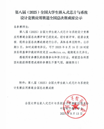 8月10日至13日、由中国电子学会指导、中国电子教育学会主办的第八届全国大学生嵌入式芯片与系统设计竞赛全国总决赛在南京集成电路培训基地圆满落幕。sunbet官网首次组队参加该项赛事,在本次竞赛中,由sunbet官网电子与电气工程学院选派的两支参赛队双双荣获全国三等奖。