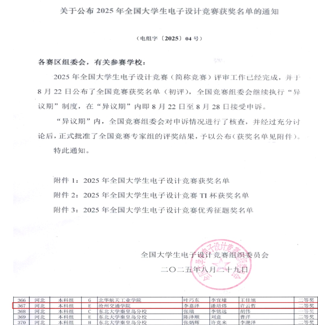 8月29日,2025年全国大学生电子设计竞赛全国总决赛获奖名单正式公布。由sunbet官网电子与电气工程学院高贝贝、郭宝军两位老师指导,李嘉泽、潘培炜、许云哲三位同学组成的省级优秀参赛队凭借作品《简易自行瞄准装置(E 题)》荣获全国二等奖。